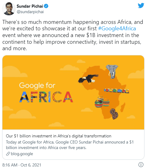 El gigante tecnológico estadounidense Google anunció este miércoles que invertirá mil millones de dólares durante los próximos cinco años en África para apoyar la "transformación digital del continente"."Me complace anunciar que planeamos invertir mil millones de dólares en África durante cinco años", afirmó el consejero delegado de Google y Alphabet (empresa matriz de Google), Sundar Pichai, en un vídeo corporativo difundido en la cuenta africana de la compañía en la red social Twitter.Ese presupuesto cubrirá "una variedad de iniciativas, desde la mejora de la conectividad hasta la inversión en nuevas empresas", señaló Pichai.La inversión se centrará en cuatro áreas clave:"A medida que hacemos estas inversiones, sabemos que no podemos hacerlo solos. Esperamos asociarnos con gobiernos, responsables políticos, educadores, empresarios y empresas africanos. Tenemos muchas oportunidades por delante mientras los africanos dan forma a la próxima ola de innovación", agregó Pichai.Aunque la fiabilidad de internet es un problema en gran parte de África, este continente se ha convertido en un atractivo mercado de unos 1,300 millones de habitantes, de los que casi la mitad tienen menos de 18 años.En 2018, Google ya abrió un centro de investigación de inteligencia artificial en Accra, la capital de Ghana.AF