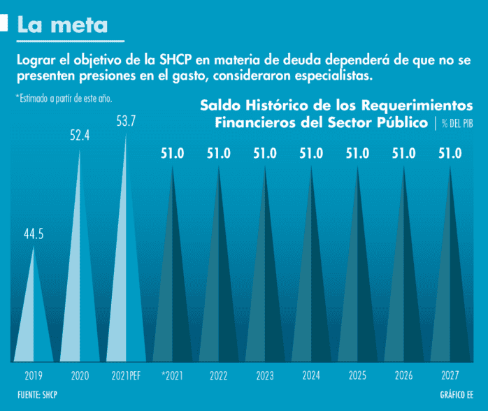 La Secretaría de Hacienda y Crédito Público (SHCP) prevé que desde este año hasta el 2027, la deuda de México se mantenga en un nivel de 51% del Producto Interno Bruto (PIB), de acuerdo con las proyecciones al interior de los Criterios Generales de Política Económica (CGPE) 2022.En el documento, la dependencia modificó a la baja su estimado del Saldo Histórico de los Requerimientos Financieros del Sector Público (SHRFSP) –la deuda en su medida más amplia– de 53.7 a 51% del PIB este año, con lo que se ubicará en 13.2 billones de pesos al cierre de este año.“Se estima que el balance primario como proporción del PIB se ubique en -0.4%, mientras que el déficit público se ubique en 3.2%, y que los Requerimientos Financieros del Sector Público (RFSP) lleguen a 4.2 por ciento. El resultado anterior implicaría que el SHRFSP culmine en un nivel de 51.0%”, se lee en los CGPE.La modificación, indicó Héctor Villarreal, director general del Centro de Investigación Económica y Presupuestaria (CIEP), es congruente con el marco macroeconómico estimado, así como la recuperación de la economía, ya que la estimación previa de 53.7% era cuestionable ya que al cierre del 2020, con la crisis por el COVID-19, el SHRFSP se ubicó en 52.4% del PIB.“Si la expectativa era crecer, que el peso se fortaleciera y se acotaran los RFSP, ¿por qué en lugar de disminuir tu saldo prevés un aumento? No era consistente con el escenario que presentaban, y nunca supieron explicarlo, por lo que este nuevo nivel de 51% sí es congruente con el proceso de recuperación de este año, el tipo de cambio y los requerimientos financieros”, explicó.El mantener los siguientes años la deuda en un nivel de 51%n del PIB no es descabellado; sin embargo, pudieran presentarse presiones del lado del gasto –como las pensiones– combinadas con ingresos tributarios débiles en comparación con otros países, además del peligro de que la economía mexicana crezca por debajo de su potencial histórico, indicaron analistas.“Llama la atención el hecho de que se mantenga en 51% ya que no se está planteando un incremento, pero tampoco una disminución pese a que se espera que la recuperación económica continúe los próximos años. Si bien como porcentaje del PIB se mantiene estable, comparándolo con el 2019, sí estamos viendo un crecimiento, por lo que con la recuperación estaríamos esperando que, por lo menos, en dos o tres años la deuda regrese a niveles de antes de la crisis”, indicó Janneth Quiroz, subdirectora de Análisis Económico de Monex.Saldo interno aumentaráA detalle, en los CGPE se observa que se espera que la deuda interna aumentará en los próximos años, situación diferente a lo que sucederá con el saldo de la deuda externa que Hacienda estimó disminuya hacia el 2027.Para este año, se prevé que la deuda interna se ubique en 33.8% del PIB, tasa que irá aumentando gradualmente los siguientes años, hasta llegar a 36.9% del PIB en el 2027. En el caso de la externa, ésta pasará de 17.2 a 14.1 por ciento.“Esto va de la mano con lo que estamos viendo en el mercado secundario en donde, desde el año pasado, se ve un menor apetito por parte de los inversionistas extranjeros por instrumentos emitidos por países emergentes. Y se espera que continúe así ante algunos factores de incertidumbre, sobre todo los asociados a la normalización de la política monetaria por parte de la Reserva Federal”, explicó Janneth Quiroz.Si te interesó esta noticia y quieres saber más, entonces descarga y descubre INFORMAPlus, la aplicación digital de EL INFORMADOR, en donde tenemos contenidos exclusivos, seleccionados por nuestros editores, para darles una experiencia más completa a los lectores.Descarga la aplicación y pruébala GRATIS por treinta días.Para iOS: https://apple.co/35jaVgb Para Android: https://bit.ly/3gwVSEVSi eres suscriptor de EL INFORMADOR tu acceso está incluido, solicítalo al 33 3678-7777.