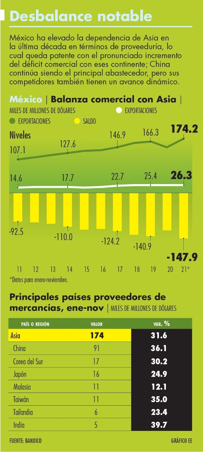 Las importaciones mexicanas de productos desde Asia rompieron récord en 2021, mientras está por entrar en vigor un Tratado de Libre Comercio (TLC) con Singapur, se iniciarán negociaciones para otro con Corea del Sur y se perfila la modernización de uno más que ya opera con Japón.Ya en los primeros 11 meses de 2021 México alcanzó un máximo histórico de importaciones originarias de Asia considerando años completos, al totalizar 174 mil 215 millones de dólares cifra que es 4.8% superior a la de todo el 2019, año previo a la pandemia de COVID-19.Estas compras abarcaron 38% del total de importaciones mexicanas de mercancías de enero a noviembre de 2021, cuando una década atrás esa porción era de 30.5 por ciento.Asia domina la producción mundial de manufacturas y otros muchos productos, con China como su epicentro.Hacia adelante, esta integración creciente podría acelerarse, debido a una serie de acuerdos comerciales que México ya puso en vigor, están en negociaciones o por ser ratificados en las correspondientes naciones asiáticas.Dos nuevos anuncios al respecto se dieron a conocer apenas la semana pasada, con dos pesos pesados de ese continente.El jueves, Fernando Ruiz Huarte, director general del Consejo Empresarial Mexicano de Comercio Exterior, Inversión y Tecnología (Comce), informó que se ha comenzado el análisis para modernizar el Acuerdo de Asociación Económica (AAE) entre México y Japón.Un día antes, los integrantes de la Alianza del Pacífico (México, Colombia, Chile y Perú) acordaron iniciar, durante el primer semestre del año 2022, el proceso de negociación con la República de Corea, como Estado Asociado de ese bloque, lo que implica pactar un TLC.Corea del Sur no ha solicitado su adhesión al Tratado Integral y Progresista de Asociación Transpacífico (TIPAT), como sí lo han hecho Reino Unido, China y Taiwán, formalmente, y Ecuador, quien ya informó su interés de ser parte.En cambio, Ruiz Huarte refirió que Corea del Sur hizo su primer intento de alcanzar un TLC con México en el último año de gobierno del presidente Ernesto Zedillo, en el 2000.Luego pretendió eso mismo en 2004, cuando México negociaba entonces un acuerdo de asociación económica con Japón, el cual entró en vigor el 1 de abril del 2005.También México, Colombia, Chile y Perú firmaron el miércoles pasado un Acuerdo Comercial con la República de Singapur, que se convertirá en el primer Estado Asociado de la Alianza del Pacífico.En sentido contrario, de enero a noviembre de 2021, las exportaciones mexicanas al continente asiático fueron de 26 mil 330 millones de dólares, una cantidad que representó 5.9% del total de las ventas foráneas de México en ese mismo periodo, cuando comparativamente ese indicador fue de 4.2% en 2011.Por su parte, el TIPAT comprende 11 economías en la Cuenca del Pacífico, que en conjunto representan 13% (11 billones de dólares) del PIB mundial, 7% (508 millones) de la población mundial y 15% (3.7 billones de dólares) de las exportaciones mundiales.El TIPAT ha estado en vigor para seis miembros desde el 30 de diciembre de 2018 (Australia, Canadá, Japón, México, Nueva Zelanda y Singapur), mientras que para Vietnam su vigencia comenzó desde el 14 de enero de 2019 y para Perú, el 19 de septiembre de 2021. Los tres miembros restantes (Brunei, Chile y Malasia) aún no ratifican el acuerdo.