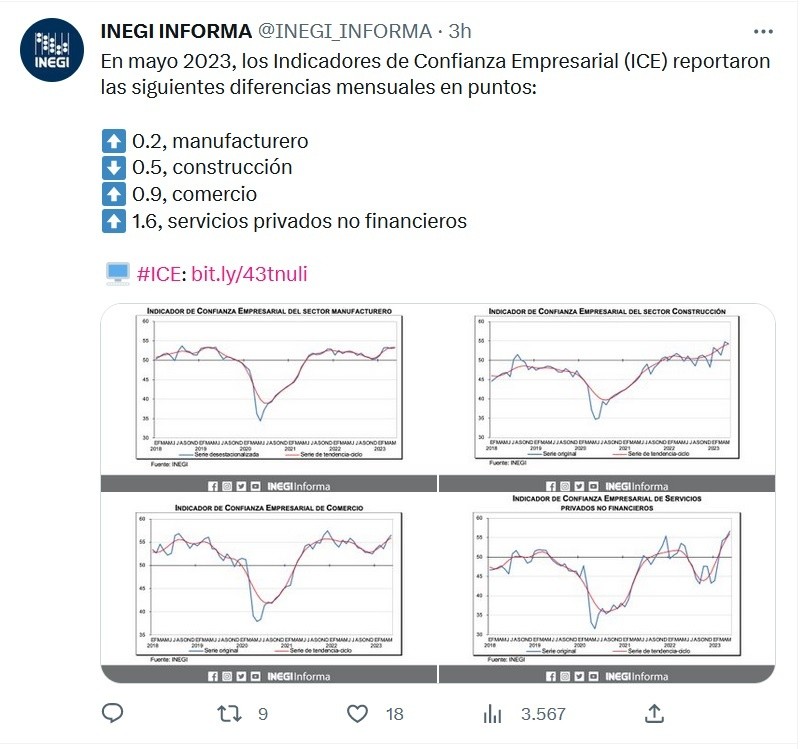 La percepción sobre la situación económica de su actividad y del país de los empresarios de la manufactura, comercio y servicios privados no financieros avanzó durante el quinto mes del año, excepto en el sector de la construcción, revelan los datos publicados por el Instituto Nacional de Estadística y Geografía (Inegi).La confianza empresarial del sector construcción registró un retroceso mensual de 0.5 unidades en mayo. Tres de los cinco componentes que integran el indicador retrocedieron durante el mes pasado, entre los que destaca el relacionado con si este es el momento adecuado para invertir con una contracción de 3.8 puntos.El indicador de confianza empresarial manufacturero registró un avance mensual de 0.2 unidades, debido principalmente al alza de 1.3 puntos en su percepción sobre la situación económica presente del país. El indicador de confianza empresarial del sector comercio reportó un incremento mensual de 0.9 unidades, sumando dos meses de crecimiento. Entre los componentes que reportaron el mayor incremento, destaca el relacionado con si este es el momento adecuado para invertir, con un alza de 5.2 puntos.Por su parte, el sector relacionado con los servicios no financieros reportó un avance mensual de 1.6 unidades, ligando cinco periodos al alza. Al igual que en el caso del comercio, el componente de mayor crecimiento fue el relacionado con si es el momento adecuado para invertir con un aumento de 3.2 puntos.En términos generales y con base en cifras originales, el indicador global de la opinión empresarial reportó una variación anual de 2.8 unidades para ubicarse en los 55.71 puntos, su nivel más alto desde 2017, cuando inició su registro. JM