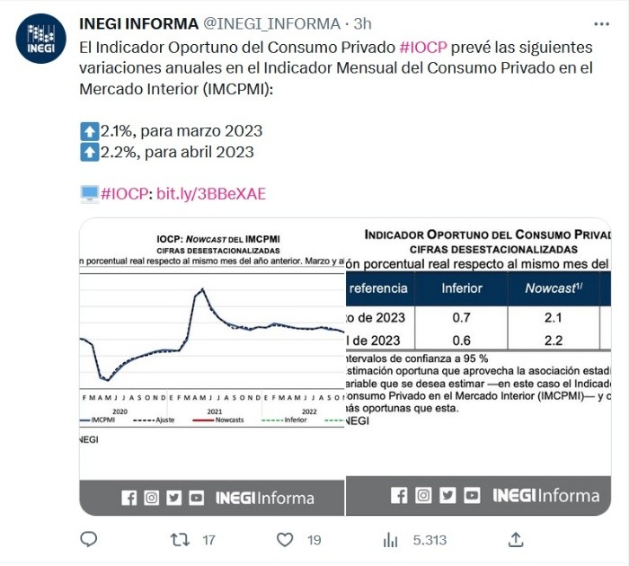 Uno de los principales motores de la economía mexicana, el consumo privado en el mercado interno, habría reportado un crecimiento mensual en abril pasado luego de dos periodos a la baja, estimó el Instituto Nacional de Estadística y Geografía (Inegi).Los resultados del Indicador Oportuno del Consumo Privado (IOCP) que se publican como estadística experimental, permiten contar con estimaciones preliminares sobre la evolución del Indicador Mensual del Consumo Privado en el Mercado Interior (IMCPMI), con base en cifras ajustadas por estacionalidad.Para abril de 2023, el indicador oportuno estima que el consumo privado en el mercado interno registró un incremento mensual de apenas 0.2%, luego de una baja prevista para marzo de -0.3% y una disminución ya observada de -1.1% en febrero.Cabe recordar que la inflación general ligó tres meses a la baja al pasar de 6.85% a tasa anual en marzo a 6.25% en abril, lo que habría incidido en las decisiones de los consumidores.Para marzo de 2023, el IOCP estima una variación anual del consumo privado en el mercado interno de 2.1%, mientras que para abril se calcula un alza de 2.2%, ambas tasas las más bajas desde marzo de 2021 cuando el indicador inició su recuperación del impacto de la pandemia.Mientras que el IMCPMI se da a conocer aproximadamente nueve semanas después de terminado el mes de referencia, el IOCP ofrece una primera estimación apenas dos semanas después de terminado el mes referencia y una segunda estimación, en general más precisa, seis semanas después del cierre del mes de referencia, explicó el Inegi.JM