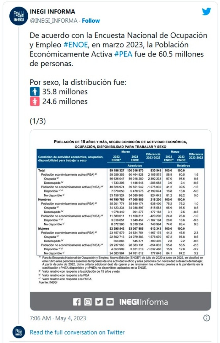 La tasa de desempleo en México bajó en marzo pasado al 2.4 % de la población económicamente activa (PEA), informó este jueves el Instituto Nacional de Estadística y Geografía (Inegi).El dato es menor al índice de 2.7 % de febrero pasado y al de 3 % del tercer mes de 2022, precisó el organismo autónomo en su reporte."La población desocupada fue de 1.4 millones de personas y la tasa de desocupación (TD), de 2.4 % de la PEA. Respecto a marzo de 2022, la población desocupada descendió en 287 mil personas y la TD fue menor en 0.6 puntos porcentuales", detalló el Inegi.La PEA del tercer mes del año fue de 60.5 millones de personas de 15 años y más, lo que representó una tasa de participación de 60.5 % y una población activa superior en 2.1 millones a la de marzo de 2023.De la PEA, 59 millones de personas estuvieron ocupadas durante marzo, 2.4 millones más que en el mismo mes de un año antes.Las personas subocupadas, es decir, quienes declararon tener necesidad y disponibilidad para trabajar más horas, fueron cuatro millones, el 6.8 % de la población ocupada y una reducción de 742 mil personas con relación a marzo de 2022.Los trabajadores en el sector informal en marzo totalizaron 32.5 millones, lo que bajó la tasa de informalidad a 55 %, unos 0.8 puntos porcentuales menos que un año antes.La población ocupada por sector de actividad se distribuyó con 43.4 % del total en servicios, en comercio 19.4 %, en la industria manufacturera el 16.8 %, en actividades agropecuarias 11 % y en construcción 8.1 por ciento.Mientras que en "otras actividades económicas", que incluyen minería, electricidad, agua y suministro de gas, estuvo ocupada el 0.7 %, y otro 0.6 % no especificó actividad.Por género, la PEA femenina en marzo fue de 24.62 millones y la masculina de 35.84 millones, con una tasa de participación económica de 46,5 % en las mujeres en edad de trabajar y de 76.2 % en los hombres.Las cifras de empleo reflejan el comportamiento de la economía de México, cuyo Producto Interno Bruto (PIB) creció un 3.9 % interanual y un 1.1 % trimestral en el primer trimestre de 2023, según la estimación oportuna que el Inegi difundió la semana pasada.JM
