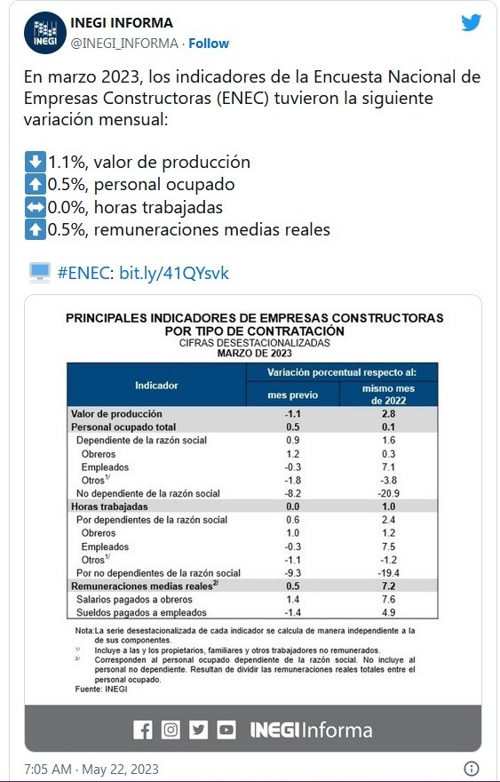 El valor de la producción de las empresas constructoras en México registró un retroceso mensual de 1.1% en febrero, luego del ligero avance de 0.2% observado en el segundo mes del año, revelan datos publicados por el Instituto Nacional de Estadística y Geografía (Inegi).De esta forma, este indicador todavía se encuentra 8.1% por debajo al alcanzado en enero de 2020 previo a la pandemia y es 32.2% menor a su máximo histórico alcanzado en octubre de 2012 con base en cifras ajustadas por estacionalidad, lo que hace a este sector uno de los más rezagados de la economía.Por tipo de obra, cuatro de los seis grupos que comprende la construcción reportaron una disminución en el valor de su producción durante el tercer mes del año. El segmento relacionado con Otras construcciones fue el que observó el mayor retroceso con una baja mensual de 3.9 por ciento. Asimismo, la división de electricidad y telecomunicaciones reportó una caída mensual de 3.3%, seguido del segmento relacionado con agua, riego y saneamiento que reportó una disminución de 1.6%. así como edificación -0.1%. Destaca esta última actividad por ser la que tiene mayor peso en el valor de la producción del sector con una participación del 40% del total.Por el contrario, la división de petróleo y petroquímica reportó un aumento mensual de 1.3% y transporte y urbanización, 1.1 por ciento.El valor de la producción de las empresas constructoras con base en cifras originales reportó un alza anual de 2.6% en marzo, la tasa más baja desde septiembre del año pasado. Por sector contratante de la obra, la iniciativa privada registró una baja de 2.4%, mientras que el sector público aumentó 9.2 por ciento. JM