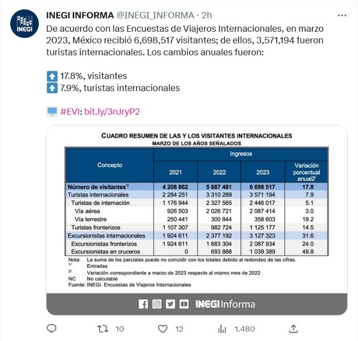 México recibió en marzo pasado un 7.9 % más de turistas internacionales que en el mismo mes de 2022, acompañado de un aumento de más del 7 % en el ingreso de divisas por este rubro, informó este miércoles el Instituto Nacional de Estadística y Geografía (Inegi).Al país ingresaron 3.57 millones de turistas extranjeros en el tercer mes de 2023, comparado con los 3.31 millones del mismo lapso del año anterior, según el informe del organismo autónomo.El principal repunte anual sucedió en los turistas por vía terrestre, que en marzo de 2023 crecieron un 19.2 % hasta superar las 358 mil personas.Mientras que aquellos que llegaron por avión se incrementaron en 3 % a más de 2.08 millones.Por otro lado, en marzo de 2023, el gasto total de los turistas internacionales se elevó un 7.3 % interanual al pasar a dos mil 712.8 millones de dólares desde una cifra previa de dos mil 527.3 millones de dólares.En contraste, el gasto medio de cada turista decreció un 0.5 % hasta los 759.63 dólares en marzo comparado con los 763.46 dólares en el tercer mes de 2022.Los datos reflejan una tendencia al alza del turismo en México, que tuvo 38.3 millones de turistas internacionales durante 2022, un 20.3 % más que en 2021.El ingreso de divisas por visitantes internacionales el año pasado fue de 26 mil 346.9 millones de dólares, más del 42 % que un año antes.La economía relacionada con el turismo en México, que el Inegi llama Producto Interno Bruto (PIB) turístico, creció un 14.4 % en 2022.México fue el tercer país más visitado en el mundo en 2020, un fenómeno coyuntural que se atribuye a las medidas sanitarias flexibles en las zonas turísticas del país en medio de la pandemia de COVID-19.JM