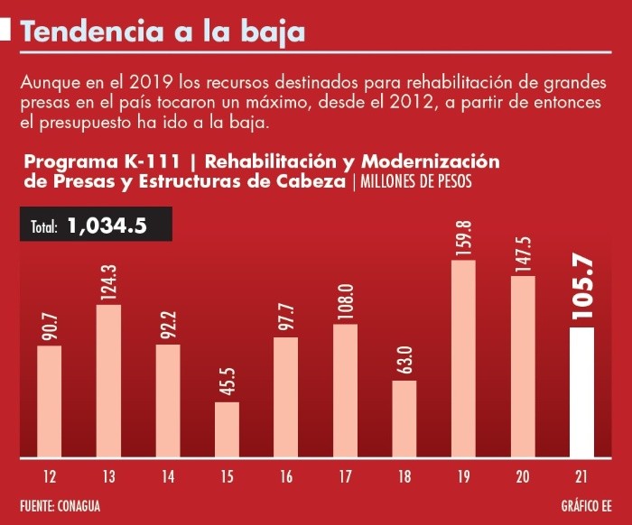 Más de mil 034 millones de pesos se han destinado para la rehabilitación y modernización de presas en nuestro país desde el 2012 a septiembre de este 2021, cifra que, a decir de expertos consultados, resulta muy baja ya que la gran mayoría de estas se encuentran en la etapa final de su vida útil y fenómenos naturales evidencian las carencias.Mediante una solicitud de información, la Subdirección General de Infraestructura Hidroagrícola de la Comisión Nacional del Agua (Conagua) indicó a El Economista que por medio de la Gerencia de Construcción de Infraestructura Hidroagrícola, y en específico del Programa K-111 Rehabilitación y Modernización de Presas y Estructuras de Cabeza, ha realizado diferentes trabajos en algunas de las obras que tiene a su cargo y que están consideradas en la relación de las 210 Principales Presas en México.En el 2015 se registró la inversión más baja en dicho lapso, la cual fue de 45 millones 484 mil 077.22 pesos, los cuales fueron distribuidos en 17 obras, la rehabilitación y modernización de la presa Luis Donaldo Colosio (Huites), ubicada en Sinaloa fue la que obtuvo mayores recursos, un total de 6 millones 806 mil 664 pesos, le sigue la presa Sanalona con 5 millones 604 mil 327 pesos en el mismo estado.En el otro extremo, el año en donde se obtuvieron mayores recursos para invertir en la rehabilitación de las presas en nuestro país fue el 2019, con un monto total de 159 millones 811 mil 412.38 pesos. Este año fue el que registró el mayor número de obras con un total de 49 proyectos. El proyecto solitario que mayores recursos obtuvo fue el de la Presa Endhó, en Hidalgo, con un monto total de 8 millones 671 mil 602.45 pesos.Faltan recursosAnte este panorama, Judith Domínguez, Coordinadora del Foro de Seguridad Hídrica de El Colegio de México y Manuel Perló Cohen, investigador del Instituto de Investigaciones Sociales de la UNAM, aseguraron que la inversión realizada por el gobierno federal en estas presas resulta muy baja.“Creo que esos mil 034 millones en un periodo de casi 10 años es poco, porque el mantenimiento que requieren es realmente costoso (…) y el programa que estaba destinado a dar mantenimiento a las grandes presas es el K-111, realmente es muy modesto”, mencionó Domínguez.La especialista indicó que fenómenos naturales como las lluvias y sequías ponen en evidencia la falta de mantenimiento en algunos cuerpos de agua en el país.“Los problemas surgen cuando hay lluvias extrema o sequías el otro extremo, se nota el estado real en el que se encuentran las presas, azolvadas y requieren ese mantenimiento y eso no se está haciendo”, lamentó.Por su parte, Perló Cohen detalló que la falta de rehabilitación y modernización influye directamente en la pérdida de capacidad de almacenamiento de las presas en nuestro país.“La carencia de agua está determinada por las lluvias, por la capacidad de almacenamiento y también por los sistemas de distribución, es toda una cadena que se origina en las presas”.Ambos especialistas coincidieron que la gran mayoría de estas grandes presas fueron construidas en la década de los 40 y 50, las cuales ya están en el límite de su vida útil, ya que consideraron que tienen un durabilidad de entre 50 y 70 años de servicios.Sin embargo, reconocieron que la solución no es la construcción de nuevas obras de infraestructura, salvo en algunos casos.“Tenemos que destinar un presupuesto mayor para el mantenimiento, porque es un problema de seguridad nacional. Con las lluvias que hemos tenido, si en algunas presas se quiebran o no funcionen bien las compuertas pues claro es un problema de seguridad”, indicó Judith Domínguez.Si te interesó esta noticia y quieres saber más, entonces descarga y descubre INFORMAPlus, la aplicación digital de EL INFORMADOR, en donde tenemos contenidos exclusivos, seleccionados por nuestros editores, para darles una experiencia más completa a los lectores.Descarga la aplicación y pruébala GRATIS por treinta días.Para iOS: https://apple.co/35jaVgbPara Android: https://bit.ly/3gwVSEVSi eres suscriptor de EL INFORMADOR tu acceso está incluido, solicítalo al 33 3678-7777.
