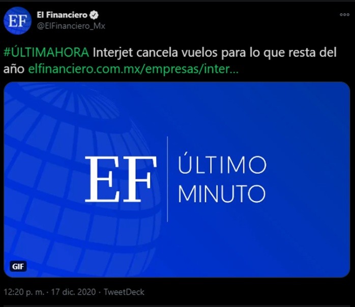 La aerolínea Interjet canceló sus vuelos para lo que resta del año.La línea aérea habría comunicado a sus trabajadores que no volverá a operar 2020, por lo que todas las operaciones planeadas del 18 al 31 de diciembre quedaron suspendidas, según información de El Financiero.Con esto, sumarán más de tres semanas sin vuelos por parte de Interjet.Interjet, que es propiedad de Alejandro del Valle, inversionista que compró el 90% de las acciones a la familia Alemán adeuda más de seis quincenas a los trabajadores, vales de despensa y contribuciones al seguro social de casi medio año, dice el diario.Asimismo, la empresa tiene deudas superiores a los dos mil 600 millones de pesos en combustible, además con el con el Servicio de Administración Tributaria (SAT) que superarían los tres mil millones de pesos.La crisis sanitaria por el coronavirus afectó aún más a la empresa, que ha cancelado cientos de vuelos y ha afectado a sus pasajeros.OF