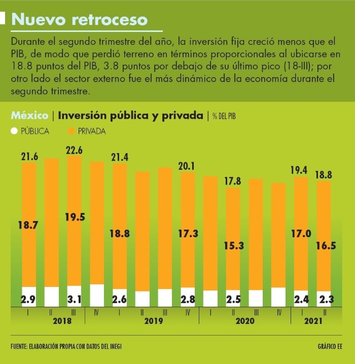 La inversión en capital físico del sector público se ubicó en 2.26 puntos porcentuales del Producto Interno Bruto (PIB) durante el segundo trimestre del 2021, su nivel más bajo para un segundo trimestre desde 1999, de acuerdo con cálculos a partir de cifras reportadas ayer por el Instituto Nacional de Geografía y Estadística (Inegi).Durante el segundo cuarto del 2021, el gasto en capital físico de la economía mexicana en su conjunto bajó de 19.4 a 18.8 puntos del PIB, luego de que la inversión privada también retrocediera, en este caso de 17.05 a 16.52 puntos del producto, muestran los datos de la Oferta y Demanda Global de Bienes y Servicios publicados por el Inegi.La reactivación de la inversión ha sido titubeante en el último año, pues luego de tocar un mínimo histórico de 17.8% del PIB durante el segundo trimestre del 2020, ha tenido dos trimestres de avances y dos trimestres de caídas, con lo que aún está lejos del nivel de 22.6% del PIB del tercer trimestre del 2018, el último pico del indicador.En el caso de la inversión física pública, la participación de 2.26% del PIB –equivalente a 585 mil 911 millones de pesos corrientes– resulta el menor registro desde el segundo trimestre de 1999, cuando se ubicó en 1.84% del producto.Este indicador también se ubica en un nivel lejano respecto de la marca de 5.18% del PIB del segundo semestre del 2010, un año después de la crisis que detonó el estallido de la burbuja hipotecaria en Estados Unidos.En junio del 2019, siete meses después de la toma de posesión del presidente Andrés Manuel López Obrador, su gobierno y la iniciativa privada representada por el Consejo Coordinador Empresarial (CCE) firmaron el Acuerdo para promover la Inversión y el Desarrollo Incluyente, en el que se plantearon como meta una inversión física de 25% del PIB, de la cual 20 puntos serían sector privado y cinco, del público.No obstante, tanto la inversión pública como la privada han caído de manera más o menos sostenida a lo largo del sexenio, incluso al margen del impacto negativo de la pandemia de COVID-19.En el caso de la vertiente privada, el menor dinamismo inversor coincide con decisiones de política pública del actual gobierno como la cancelación de la obra del aeropuerto de Texcoco, la suspensión de subastas de bloques petroleros y de compras de electricidad, así como la negativa del gobierno para la realización de inversiones privadas, como la de una nueva planta cervecera en el estado de Baja California.En tanto, la inversión pública se ha contraído en medio de una priorización del gasto social (pensión universal a adultos mayores, becas a jóvenes aprendices, subsidios para la siembra de árboles, etc.), que rebasa el presupuesto para las obras insignia del gobierno como el Tren Maya, el Aeropuerto Internacional Felipe Ángeles y la refinería de Dos Bocas.Recuperación previstaEn el Proyecto de Presupuesto de Egresos de la Federación 2022, el gobierno plantea un alza de 17.7% en el gasto de inversión pública respecto de lo aprobado para el 2021, a 863 mil 200 millones de pesos, lo cual implicaría que alcance una participación de 3.1% del PIB, que sería 0.1 puntos más respecto de lo proyectado para este año.El Centro de Estudios Económicos del Sector Privado aplaudió la iniciativa, pero resaltó que alcanzar dicho nivel “estará en función de la disponibilidad de recursos y de la capacidad del gobierno para efectivamente llevar a cabo los proyectos presupuestados”.Y recordó que este 2021 se aprobó un gasto de inversión física superior en 8% al aprobado para el 2020, pero las cifras oficiales indican que en los primeros siete meses del año la inversión física ha caído 4.7%, incluyendo ya los recursos para los proyectos insignia del gobierno.Si te interesó esta noticia y quieres saber más, entonces descarga y descubre INFORMAPlus, la aplicación digital de EL INFORMADOR, en donde tenemos contenidos exclusivos, seleccionados por nuestros editores, para darles una experiencia más completa a los lectores.Descarga la aplicación y pruébala GRATIS por treinta días.Para iOS: https://apple.co/35jaVgb Para Android: https://bit.ly/3gwVSEVSi eres suscriptor de EL INFORMADOR tu acceso está incluido, solicítalo al 33 3678-7777.