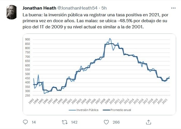 El subgobernador del Banco de México (Banxico), Jonathan Heath, anticipó como buena noticia que en 2021, la inversión pública registrará una tasa positiva por primera vez en los últimos 12 años.En su cuenta de Twitter hizo varios comentarios respecto a la información que dio a conocer el Instituto Nacional de Estadística y Geografía (Inegi), sobre el desglose del Producto Interno Bruto (PIB)."La buena: la inversión pública va registrar una tasa positiva en 2021, por primera vez en doce años. Las malas: se ubica -48.5% por debajo de su pico del 1T de 2009 y su nivel actual es similar a la de 2001", ponderó.Explicó que esto podría ser después de que se estancó la inversión total en el país entre 2015 y 2018, y disminuyó 4.7% en 2019 para desplomarse 17.9% en 2020.Destacó que con una tasa de 1.3% durante el tercer trimestre del presente año, lleva cinco trimestres consecutivos de crecimiento positivo, pero todavía -15.3% por debajo del tercer trimestre de 2015.Al enfatizar que lo más interesante del desglose del PIB por el lado del gasto entre julio y septiembre del 2021, es que señala crecimiento en la inversión pública en los tres trimestres del año.Lo anterior, estimó, apunta a una tasa positiva para todo 2021. "¿Será la primera tasa positiva después de 11 años de caídas?", cuestionó.ER