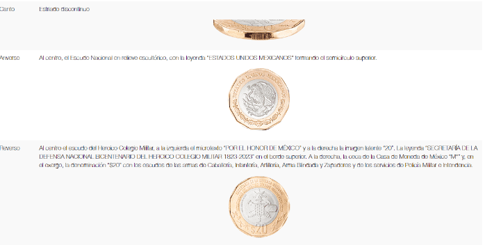 Para los coleccionistas y especialistas en numismática conmemorativas, hay una nueva moneda que ha causado mucho furor. Este 2023 se puso en circulación una pieza que se convirtió en una de las más buscadas. Se trata de la moneda conmemorativa de $20 pesos por el Bicentenario del Heroico Colegio Militar, la cual se puso en circulación el pasado 11 de octubre.Andrés Manuel López Obrador dio a conocer la nueva moneda conmemorativa y luego de un decreto publicado en el Diario Oficial de la Federación, la moneda de 20 pesos comenzó a circular. Y desde entonces hasta ahora es difícil encontrar esta pieza, y por ello es que su valor ha aumentado tanto.En Mercado Libre hay un vendedor osado que la ha puesto a la venta por $150,000 pesos mexicanos. Esta es, la apuesta más cara del mercado, pues hay ejemplares mucho más económicos, pero ¿cómo es la nueva moneda conmemorativa?La nueva moneda conmemorativa de $20 pesos se compone de una aleación de alpaca plateada de 65% cobre, 10% níquel y 25% de zinc en su parte central. Además, el anillo perimétrico en su parte central. Además, el anillo perimétrico tiene como base una aleación de bronce-aluminio cuyo contenido es 92% cobre; 6% de aluminio y 2% de níquel.Además, de acuerdo con el Banco de México, entre las características de la moneda resalta lo siguiente:Si bien un vendedor puso esta oferta en Mercado Libre, hay otros vendedores que la venden por un precio mucho menor. En la misma plataforma, otro usuario puso a la venta con envio a todo el páis, 100 monedas conmemorativas de $20 pesos del Heroico Colegio Militar por $5,399 pesos mexicanosNo obstante, si el interesado hace una búsqueda actual en la plataforma de compra venta, encontrará la misma moneda por un precio muchísimo más económico, desde $500 pesos: Mantente al día con las noticias, únete a nuestro canal de Whatsapp.MM