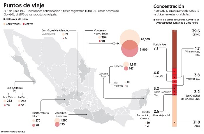 El turismo se alista para reabrir a partir de las primeras semanas de junio, sin embargo, las plazas vacacionales más importantes del país están lejos de considerarse destinos con bajo riesgo de contagio de COVID-19. En el país hay 70 plazas de vocación turística que concentran 58 por ciento de los casos activos de COVID-19, de acuerdo con un análisis realizado por El Financiero con información de cada uno de las localidades en donde se encuentran los principales centros vacacionales. Al 2 de junio, México registró 16 mil 940 casos activos de coronavirus, de los cuales 9 mil 978 se ubicaron en ciudades, pueblos mágicos, playas o centros urbanos en donde se concentran las actividades turísticas, en estados como la CDMX, Quintana Roo, Baja California Sur, Baja California, Jalisco y Guerrero. La Secretaría de Turismo, a cargo de Miguel Torruco, ha insistido en que la reapertura de la ‘industria sin chimeneas’ será acorde a las condiciones de salud de cada estado, sin embargo, todo el país, salvo Zacatecas, se encuentra en semáforo epidemiológico en rojo, es decir, en un momento de nuevos contagios elevados y decesos en aumento. El presidente del Consejo Nacional Empresarial Turístico, Braulio Arsuaga, llamó a conocer, de forma anticipada, las condiciones de reapertura de los destinos para que pueda realizarse su reactivación de forma responsable. En total, los destinos de esparcimiento en el país acumulan el 57 por ciento de las muertes registradas en el país, es decir, 6 mil 86. Pese a que el gobierno ha insistido que el fin de la Jornada Nacional de Sana Distancia, el 30 de mayo, no significa un regreso a las actividades laborales de forma inmediata, destinos como Quintana Roo, Los Cabos y Acapulco ya alistan la apertura de algunos hoteles, el regreso de sus trabajadores y la implementación de medidas sanitarias para garantizar la seguridad de sus visitantes. Cancún, Cozumel, Isla Mujeres, Tulum y el resto de los destinos turísticos de Quintana Roo comenzaron a abrir el 1 de junio. Los trabajadores de los hoteles regresaron a sus sitios de trabajo, con las medidas de sanitización, para alistar las instalaciones de hospedaje, las cuales a recibirán visitantes el 8 de junio. Roberto Cintrón, presidente de la Asociación de Hoteles de Cancún, Puerto Morelos e Isla Mujeres, informó que los hoteles abrirán con un porcentaje reducido de ocupación que les permita comenzar a reactivar sus operaciones y sus ingresos. La expectativa es que, para el verano, la ocupación de los destinos turísticos de la entidad llegue hasta el 55 por ciento. Por su parte, José Chapur, presidente de Grupo Palace, señaló que la vigilancia del distanciamiento social al inicio de la reapertura no será ‘necesaria’ pues los niveles de afluencia de turistas serán bajos. “Al principio (el distanciamiento) se va a dar de forma natural en los vuelos como en los hoteles, cuando ya tengamos que cuidar el distanciamiento es cuando el destino ya esté activo y eso nos permitirá abrir más y más hoteles”, señaló Chapur. Los municipios de Quintana Roo presentan bajos casos activos de COVID-19, frente a otras localidades turísticas, como Acapulco. Este destino de Baja California Sur se apegará al semáforo federal, sin embargo, ya tiene un plan de 5 fases para reabrir los hoteles, servicios turísticos y restaurantes. La primera está prevista para junio, en donde, según Rodrigo Esponda, director general el Fideicomiso de Turismo de Los Cabos (Fiturca), se iniciará la conexión internacional del destino, particularmente con los Estados Unidos. Además, en este mes se implementarán los protocolos de sanidad para garantizar que los establecimientos sean seguros. “Esperamos que la reactivación sea más rápida de lo que puede ser en otras partes por el hecho de que (Los Cabos) no es un destino masivo”, refirió. El destino guerrerense retomará actividades turísticas en función del semáforo emitido por el gobierno federal, que sólo contempla aglomeraciones en la luz ‘verde’ y que por ahora no considera reactivar la llamada ‘industria sin chimeneas’. De acuerdo con la presidenta de Acapulco, Adela Román, los hoteles, las playas y los restaurantes continuarán cerrados, por lo que los turistas no podrán vacacionar en el municipio hasta que las condiciones de transmisión se reduzcan.