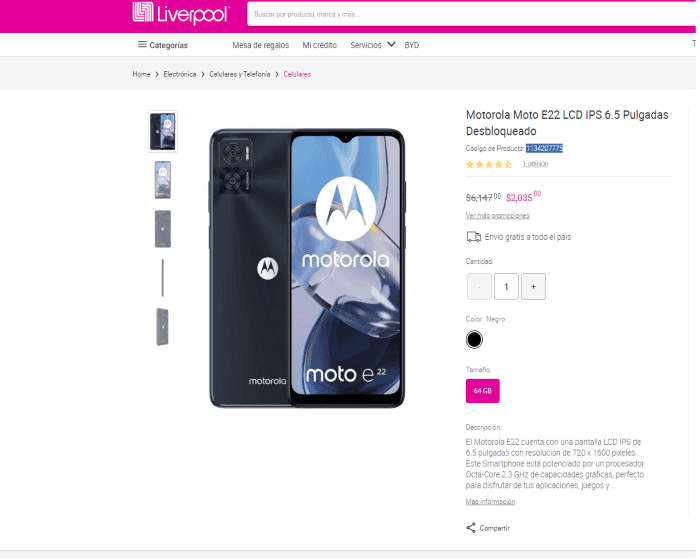 El teléfono celular se ha convertido en un acompañante infaltable para la mayoría de las personas. Ya sea para trabajo, educación, diversión o para tomar fotos, la gente busca los modelos que mejor rendimiento tengan a comparación de su precio.Liverpool trae en oferta un celular que cumple con creces con todas las exigencias, con una increíble rebaja del 60%, te contamos de qué se trata.Se trata del Motorola Moto E22 LCD, de 6.5 pulgadas con una cámara con 720 x 1600 píxeles de potencia.Este smartphone cuenta con un potente procesador Octa-Core 2.3 GHz, que permite un excelente rendimiento y una durabilidad muy buena. Su precio original es de 6 mil 147 pesos mexicanos, pero puedes llevar a tu casa este increíble dispositivo por solamente $2 mil 035, con envío gratis a toda la república mexicana. Conoce más de este potente aparato en la página oficial de Liverpool, el código de producto es 1134207775.***Mantente al día con las noticias, únete a nuestro canal oficial de WhatsAppFA