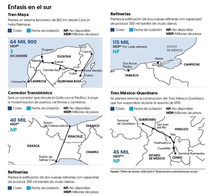 El Corredor Transístmico, el Tren Maya, dos nuevas refinerías y el tren México- Querétaro son los cinco proyectos que encabezarán el plan de infraestructura 2018-2024, de acuerdo con documentos de la campaña del virtual presidente electo Andrés Manuel López Obrador y parte de su equipo. Dos de los principales proyectos tienen el sur de México como común denominador, según detalla el documento PejenomicsII. Éstos son el Tren Maya y el Corredor Transístmico. Es “natural” que las principales iniciativas en esta materia tengan como objeto el sur del país, explicaron especialistas, pues se trata de la región con más rezago económico. Tan sólo en Oaxaca y Chiapas, según datos de Coneval, habita el 27 por ciento de los mexicanos en pobreza extrema.El Tren Maya consistiría en la construcción de un sistema ferroviario de 852 kilómetros desde Cancún, Quintana Roo, hacia el sur, hasta Palenque, Chiapas. Mismo que pasará por sitios turísticos como Tulum y Bacalar. Este tren está planeado para el sector turístico, pero se prevé que en determinados horarios transporte a trabajadores que laboren en dicho sector. “Podrías sustentar el desarrollo de nuevos atractivos turísticos en la región, porque ya tienes más canales de transporte de posibles usuarios que sustentan invertir en nueva infraestructura”, consideró Alejandro Villarreal, especialista del sector. Se estima que el tren alcance velocidades de 160 kilómetros por hora y haga el recorrido de Cancún a Palenque en nueve horas. Su licitación está prevista para el 3 de diciembre. Esta no es la primera vez que se anuncia el proyecto, en el sexenio que está por concluir el llamado Tren Transpeninsular, que levantó el interés de CICSA, ICA y OHL, se canceló por falta de recursos. El segundo proyecto que se menciona en PejenomicsII es el Corredor Transístmico. Éste, que también ha sido anunciado en anteriores sexenios, vincularía el Pacífico con el Golfo. El Transístmico, que según AMLO competirá con el Canal de Panamá, contempla la modernización de los puertos de Coatzacoalcos y Salina Cruz, así como la recuperación de la vía férrea entre las dos localidades. También involucraría una zona industrial; recintos fiscalizados, un puerto seco e incluso gasoductos. “El objetivo de este proyecto es mejorar la conectividad entre el Pacífico y el Golfo, y fomentar no sólo el desarrollo de esta infraestructura, sino el comercio exterior”, destacó Ignacio García de Presno, especialista en infraestructura de KPMG. Otra de las propuestas del presidente electo es la autosuficiencia energética a través de la construcción de dos nuevas refinerías, que producirían 300 mil barriles diarios. Aunque aún no se ha anunciado la ubicación definitiva, AMLO ha dicho que podrían edificarse en Atasta, Campeche y Dos Bocas en Paraíso, Tabasco. En su Plan de Nación, el tabasqueño también plantea la instalación de biorefinerías para la producción de biodiesel y la recuperación del proyecto de la Refinería Bicentenario en Tula, Hidalgo. Las dos refinerías planteadas se unirían a las seis que ya hay en el país, las cuales serían rehabilitadas, ya que, según cifras de Morena, operan al 40 por ciento de su capacidad. Otro de los planes, reveló Javier Jiménez Espriú, quien podría ser el titular de la Secretaría de Comunicaciones y Transportes, será definir una red nacional de ferrocarril. Para esto, dijo, se retomará la construcción del Tren México-Querétaro. Esta vía, de 210 kilómetros y que preveía transportar a 23 mil pasajeros diarios, se canceló en 2015. Este tren, dijo Jiménez Espriú, será “un elemento de vinculación de dos centros muy importantes y además es el arranque de un tren que después iría por Guadalajara y Tijuana y otro que iría desde Querétaro hasta Laredo”.