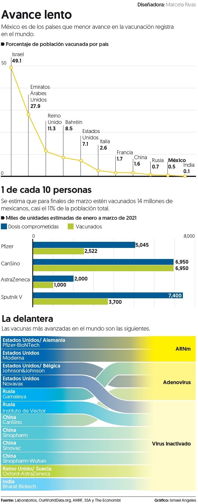 El pasado 9 de noviembre, Pfizer y su socio alemán BioNTech se convirtieron en el primer laboratorio en el mundo en aprobar su vacuna contra el coronavirus, una carrera a la que ya se sumaron Moderna, AstraZeneca/ Oxford, Gamaleya Institute y Sinopharm, que ahora enfrentan diversos retos para cumplir sus millonarias metas de producción.Se prevé que este año Pfizer y Moderna reporten cerca de 18 mil millones de dólares en ingresos por sus vacunas contra el COVID-19, 15.4 veces más que los mil 100 millones de dólares con los que cerrarían el 2020, según estimaciones de analistas compiladas por Bloomberg.“La conversación sobre la vacuna ha girado en torno a la logística: aprobaciones de su administración, la velocidad de su producción, los países que compiten por asegurar dosis suficientes para vacunar a sus poblaciones y, más recientemente, las preocupaciones en torno a la ampliación y la aceleración del despliegue en países de todo el mundo”, comentó en un reporte, Natalia Castellanos, líder de Consumer Insights para América Latina en NielsenIQ.Las vacunas que ya recibieron aprobación requieren de ciertos reactivos base que en condiciones normales son sencillos de obtener, pero por la demanda mundial, pueden llegar a escasear, como en el caso de Pfizer y Moderna.“Hay relativamente pocos productores de nanopartículas lipídicas. Creo que sólo hay dos de escala en Europa. Informes recientes sugieren que Pfizer redujo a la mitad su producción estimada para 2020 después de enfrentar desafíos para asegurar suficientes nanopartículas lipídicas”, afirmó Andrey Zarur, fundador y CEO de GreenLight Biosciences, en un artículo para Stat, un medio especializado en salud.Las otras vacunas, como la de AstraZeneca, CanSino, Janssen y Sputnik V, utilizan reactivos que son muy comunes como la sacarosa, el cloruro de sodio y el glicerol, el problema es la alta demanda mundial, explicó Gabriela Ramírez, especialista de la Facultad de Ciencias Químicas de la Universidad la Salle.La Asociación Nacional de Industrias del Plástico detalló que la industria farmacéutica utiliza envases y empaques para contener vacunas, además de insumos como líquidos, píldoras, polvos y sólidos, por lo que se anticipa una gran demanda mundial.“Se proyecta que, a nivel mundial, el mercado de empaques del sector farmacéutico reportará un crecimiento de 8.2% hacia el 2025, lo que representará un aumento de 118 mil millones de dólares para la industria”, calculó.Combatir el SARS-CoV-2 es un problema mundial, por ello se creó el Fondo de Acceso Global para Vacunas COVAX, una alianza impulsada por actores públicos y privados, que busca garantizar que 92 países de bajos y medianos ingresos puedan acceder a las vacunas, al mismo tiempo que las naciones de ingresos altos.El problema, es que varios países firmaron compromisos de compras con los laboratorios, que a su vez también tienen que garantizar el abasto a las naciones pobres.“Con COVAX empiezan los conflictos de los países que ya pagaron y esperan sus entregas”, explicó Xavier Tello, analista en políticas de salud.Para las compañías farmacéuticas cualquier cambio en su cadena de proveeduría, crea un problema logístico. Por ejemplo, en el caso de la farmacéutica Moderna, los 20 millones de dosis de vacunas que entregará al gobierno de Canadá se obtendrían de su producción europea, fabricada por un socio suizo y envasada por uno español lo que implica un gran laberinto logístico.En días pasados Pfizer anunció un retraso de entregas en México y en otras partes del mundo, pues frenó un par de semanas la manufactura para ajustar la capacidad de su planta en Bélgica para producir 2 mil millones de dosis anuales, en lugar de mil 300 millones que tenía estimado originalmente.El inconveniente es que, una planta farmacéutica tarda en adaptarse y calibrarse hasta 24 meses, ahora se ha tenido que forzar para hacerse en sólo un par de semanas.Por su parte, el pasado 21 de enero, AstraZeneca sufrió el incendio de un edificio en construcción en India para aumentar la producción de vacunas contra el COVID-19.El pasado 22 de enero, el presidente Andrés Manuel López Obrador, dio su permiso para que los gobiernos estatales y la iniciativa privada pudieran comprar la vacuna, sin embargo, por ahora, ninguna de las que se han anunciado cuenta con registro sanitario, por lo que no pueden comercializarse, explicó Tello.El analista señaló que los laboratorios están vendiendo a los Gobiernos a precios especiales por el volumen, por lo que reconoció que el que quiera comprar ahora, lo hará a precios muchísimo más altos.Además, aunque la Secretaría de Salud publicó el acuerdo para que particulares puedan adquirir la vacuna, aún falta conocer qué cambios en la metodología y reglamentos realizará la Cofepris, concluyó Tello.