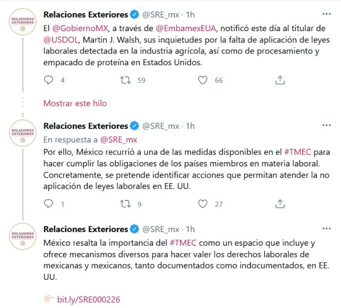 A unas horas de que el gobierno mexicano recibiera una solicitud de Estados Unidos por incumplimiento de leyes laborales, la embajada de México en el país del Norte pidió a la autoridad estadounidense revisar la situación de los trabajadores agrícolas.En una carta el gobierno de México "propuso un espacio de cooperación en el marco del T-MEC, conforme a los términos previstos en el artículo 23.12, en aras de identificar acciones que permitan atender la no aplicación de las leyes laborales en determinados sectores y estados en Estados Unidos".Solicitaron garantizar los derechos laborales contemplados en la legislación federal estadounidense y también en el capítulo 23 del Tratado entre México, Estados Unidos y Canadá (T-MEC).El Gobierno de México dijo que si bien piden cooperación para resolver el asunto eso no los hace renunciar "a los mecanismos de solución de controversias laborales previstos en el T-MEC, y reconociendo la importancia de la cooperación como mecanismo para la implementación efectiva de derechos laborales".En la misiva que entregó el embajador de México en Estados Unidos, Esteban Moctezuma, se expuso que si bien a nivel federal el gobierno estadounidense protege los derechos de los trabajadores sin importar la condición migratoria, "en la práctica, factores como el desconocimiento, el miedo y el abuso de parte de algunos empleadores impiden que los trabajadores migrantes puedan ejercer plenamente sus derechos laborales en algunas industrias y estados", explicó.La Secretaría de Relaciones Exteriores afirmó que encontraron omisiones como: "Falta de pago de salario y el tiempo extraordinario correspondiente, exclusión de los trabajadores agrícolas de el pago de tiempo extraordinario, el pago de salario mínimo en supuestos específicos, y el derecho a organizarse y negociar colectivamente".Además de "incumplimiento de los empleadores de los protocolos de descansos e instalaciones para trabajadores agrícolas. La falta de regulación federal respecto al estrés por calor en la industria agrícola"."Disparidad salarial entre los trabajadores de las empacadoras y los trabajadores de las plantas de procesamiento de proteína y acceso limitado a estaciones de lavado de manos y sanitarios en ambas industrias", se lee en el comunicado.JM