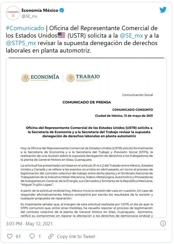 La Secretaría de Economía dio a conocer que iniciará la revisión del caso de la "supuesta denegación" de derechos laborales en la planta de General Motors (GM) de Silao, Guanajuato, tras recibir la solicitud formal de la Representación Comercial de Estados Unidos (USTR).A unas horas de que la USTR, a cargo de Katherine Tai, dijo que envió una solicitud a México para pedir la intervención en el caso GM, de acuerdo a los compromisos que asumieron bajo el Tratado entre México, Estados Unidos y Canadá (T-MEC), la dependencia mexicana expuso que la solicitud se presentó con base en el artículo 31-A 4.2 de dicho acuerdo.La solicitud "se refiere a los eventos ocurridos en abril pasado, en torno al proceso de legitimación del contrato colectivo de trabajo entre dicha planta y el Sindicato Nacional de Trabajadores de la Industria Metal-Mecánica, Sidero-Metalúrgica, Automotriz y Proveedoras de Autopartes en General, de la Energía, sus Derivados y Similares de la República Mexicana, 'Miguel Trujillo López'", dijo la Secretaría de Economía.La dependencia recordó que la Secretaría del Trabajo comunicó el 11 de mayo que repondrá el proceso de legitimación del contrato colectivo de la planta de General Motors de Silao.Reiteró que la misma Secretaría del Trabajo "ratificó su compromiso en reparar la afectación a los derechos de democracia sindical y negociación colectiva, y hacer valer los principios establecidos en la Constitución, en la Ley Federal del Trabajo y en los convenios y tratados internacionales que México ha suscrito en materia laboral".Al recibirse la solicitud, Economía afirmó que "inicia la revisión del caso en cuestión. En caso de responder afirmativamente, México compartirá por escrito los resultados de la revisión y cualquier propuesta de reparación".JM