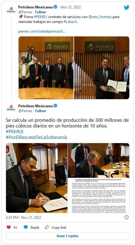 Petróleos Mexicanos (Pemex) reanudará sus trabajos de extracción de gas en el yacimiento denominado Lakach, en el sureste de México, con la inversión de mil 500 millones de dólares de la empresa estadounidense New Fortress Energy.La petrolera estatal detalló que dicho proyecto de gas en las aguas profundas del Golfo de México tenía seis años suspendido, en el que Pemex realizó inversiones por otros mil 400 millones de dólares."En esta operación, Pemex mantiene la propiedad del yacimiento y al finalizar el contrato será propietario del total de la infraestructura", aclaró en un comunicado.De acuerdo con las proyecciones de Pemex, la petrolera estará produciendo 300 millones de pies cúbicos de este hidrocarburo en un horizonte de 10 años, a partir del primer trimestre de 2024, cuando estima que inicie su elaboración.Lakach representa una reserva de alrededor de 900 mil millones de pies cúbicos, según datos de Pemex.Además, se firmó un contrato de comercialización, por el que New Fortress Energy comprará 190 millones de pies cúbicos diarios, y el resto serán para el consumo interno del país."Cabe señalar que en la periferia del Campo Lakach se encuentran otros yacimientos con una reserva tres veces mayor y que podrían hacer sinergia con el Campo Lakach, es por ello que se iniciará la evaluación para su más eficiente desarrollo", adelantó Pemex.JM