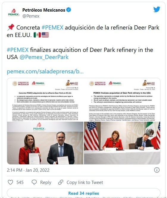Petróleos Mexicanos (Pemex) anunció este jueves la compra total de la refinería de Deer Park ubicada en Texas al adquirir la parte accionaria de Shell por casi 600 millones de dólares."El director general de Petróleos Mexicanos (Pemex), Octavio Romero Oropeza, acompañado de directivos de Pemex y de Shell Oil Company, informó que se cerró con éxito la compra total de la refinería de Deer Park, ubicada en Houston", notificó Pemex en un comunicado en conjunto con el Gobierno federal.La petrolera explicó que "al adquirirse el 50.005 % de la participación accionaria de Shell" será el "Estado mexicano quien tendrá la propiedad total de esta instalación".De esta manera, y a partir del 20 de enero, esta refinería en territorio estadounidense queda "bajo el control de Pemex".Al concluir la operación y en presencia del ingeniero Romero Oropeza, se llevó a cabo la primera sesión del Consejo de Administración de Deer Park.Como se tenía previsto, la adquisición se concretó luego de que el pasado 22 de diciembre se informó que el Comité de Inversión Extranjera de Estados Unidos (Cfius, por sus siglas en inglés) autorizó la operación de compra-venta al no haber identificado riesgos en materia de competencia ni de seguridad nacional para Estados Unidos, agregó el boletín.La transacción financiera se concluyó en los "términos pactados" y anunciados en el mes de mayo pasado: el valor de la operación por los activos de la refinería es de 596 millones de dólares, equivalente al 50 % de la participación de Shell en la deuda de la sociedad."Adicionalmente se liquidó la deuda remanente por los 596 millones de dólares que corresponden al 50 % de la participación de Pemex. Los recursos para la operación fueron cubiertos por el Fondo Nacional de Infraestructura (Fonadin)", apuntó el texto.JM