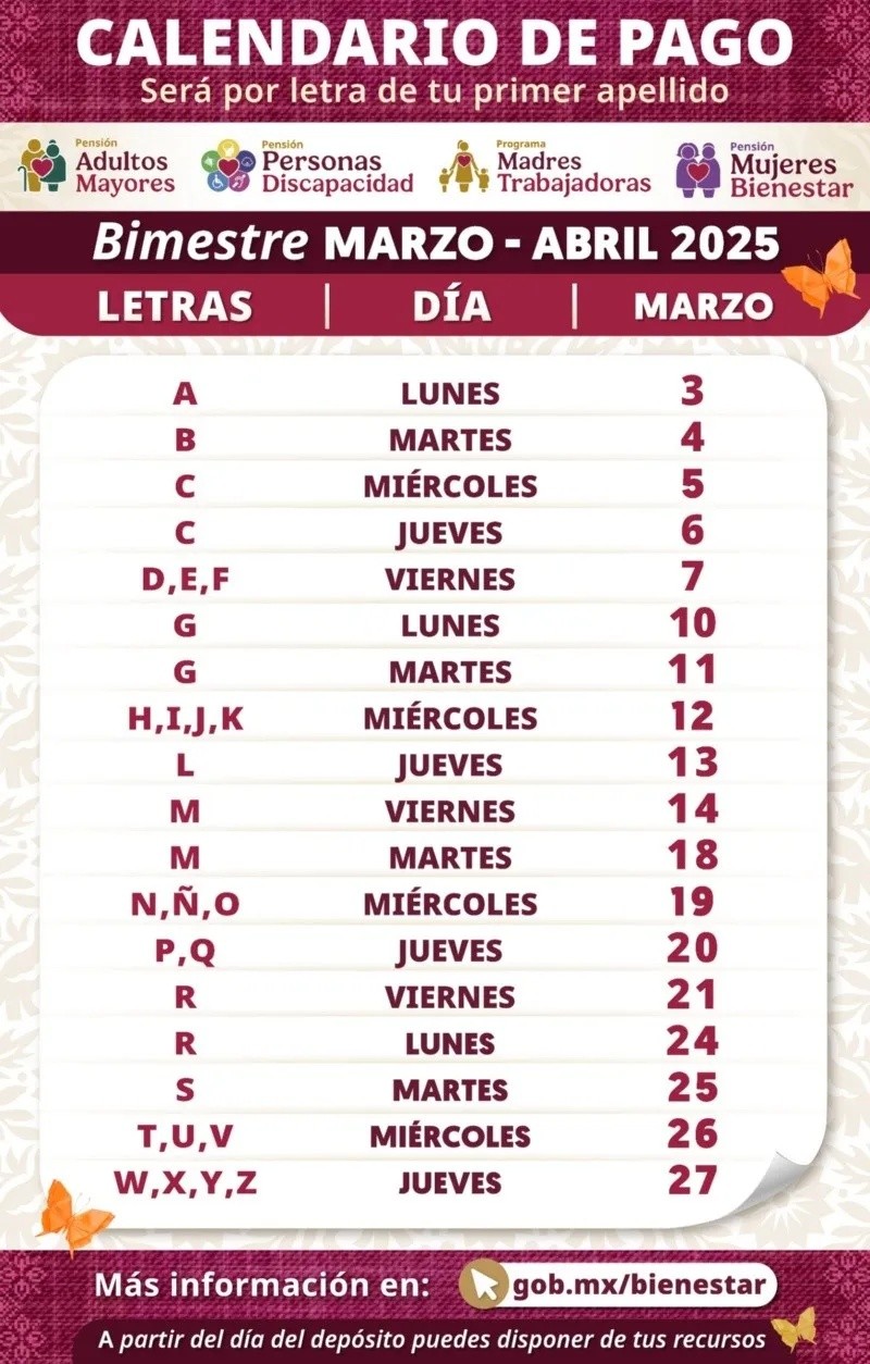 En este mes de marzo continúa la dispersión de los pagos de la Pensión Bienestar, pues la Secretaría del Bienestar compartió de manera oficial al inicio del mes el calendario de pago por apellido que comprende este bimestre de marzo-abril de 2025.La Pensión del Bienestar, es uno de los programas sociales más importantes del Gobierno de México, el cual consiste en un depósito bimestral para apoyar en la economía diaria de los adultos mayores, sin otro requisito más que hayan cumplido los 65 años de edad, sin importar su religión, creencia o estatus social.Los adultos mayores a 65 años recibirán a lo largo de este mes de marzo el pago correspondiente al bimestre marzo-abril, según anunció en sus redes oficiales Ariadna Montiel, la secretaria del Bienestar.El recurso se depositará en días específicos en la tarjeta del Bienestar de los beneficiarios, de acuerdo a la primera letra del apellido del adulto mayor.Según el calendario oficial de pago, así quedará el depósito:Jueves 20 de marzo: Apellidos con las letras "P" y "Q".para poder cobrar el depósito, es necesario contar con la tarjeta del Banco del Bienestar, sin embargo, si por algún motivo perdiste o te robaron tu tarjeta, puedes acudir a una sucursal y retirar el dinero en ventanilla.Si aún no cuentas con tu tarjeta, es importante acudir a un módulo de rezagados con la siguiente documentación: Para los adultos mayores a los que no les sea posible acudir a un módulo, pueden agendar una visita domiciliaria en el número 800 639 42 64.*Mantente al día con las noticias, únete a nuestro canal de WhatsApp aquí: https://whatsapp.com/channel/0029VaAf9Pu9hXF1EJ561i03 MV