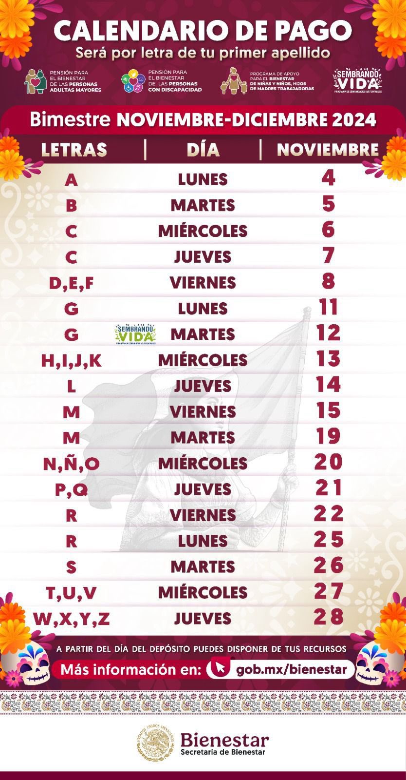 La Pensión Bienestar está de regreso este mes de noviembre, -el último del año y el primero bajo el mandato de la Presidenta Claudia Sheinbaum- con su habitual apoyo económico que beneficia a los adultos mayores de México. El pago corresponderá al bimestre noviembre-diciembre, y no regresará sino hasta el mes de enero 2025. La Pensión Bienestar es uno de los apoyos sociales más importantes del gobierno federal y del actual sexenio para ayudar a los adultos mayores de todo México, sin importar su clase social, con un beneficio económico para poder solventarlos en su economía diaria. Ariadna Montiel Reyes, la secretaria del Bienestar del Gobierno de México, compartió a través de sus redes sociales el calendario oficial para saber cuándo recibirán su depósito correspondiente los adultos mayores beneficiados. El depósito bancario se hará de acuerdo a la letra del primer apellido del adulto mayor, y así corresponderá a este bimestre correspondiente del 2024, que abarca de noviembre a diciembre. Es necesario contar con la tarjeta del Banco del Bienestar para poder cobrar el depósito, pues ya no se otorga en dinero en efectivo. Si aún no cuentas con tu tarjeta, es importante acudir a un módulo de rezagados con la siguiente documentación: Para los adultos mayores a los que no les sea posible acudir un módulo, pueden agendar una visita domiciliaria en el número 800 639 42 64. FS