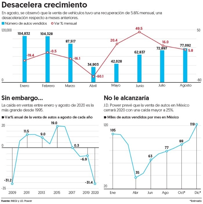 En agosto de 2020 se vendieron en México 77 mil 92 autos, cantidad 5.75 por ciento superior a lo reportado en julio pasado, además la variación representa una desaceleración con respecto a las alzas de doble dígito mensuales previas. En julio, junio y mayo, comparado con sus meses inmediatos anteriores, la comercialización de autos se incrementó 16, 49.5, 20.4 por ciento, respectivamente. En este sentido, la Asociación Mexicana de Distribuidores de Automotores (AMDA) estimó que el país regresará a niveles de venta previos a la pandemia hasta 2024. Lo anterior debido a que se trata de una lenta recuperación, donde incluso en algunas entidades como Veracruz los distribuidores automotrices no han podido retomar operaciones. “Existe una tendencia de recuperación lenta del mercado a partir del mes de mayo, respecto del punto de mayor caída de abril (…) manteniendo la expectativa de una caída superior al 27 por ciento en 2020 en comparación con el año pasado, bajo una situación inercial en al ámbito macroeconómico y social”, dijo Guillermo Rosales, director general adjunto de AMDA. Destacó que la cifra de ventas de agosto fue 4.96 por ciento menor a lo estimado por los distribuidores, esto a pesar de la reapertura de la mayoría de los pisos de venta, fuertes incentivos de fabricantes y distribuidores, tasas de interés y plazos atractivos en las ofertas de financiamiento y la satisfacción de demanda rezagada durante la contingencia. Por su parte, Gerardo Gómez, director general de J.D. Power de México, comentó que su consultora prevé que México también tendrá una recuperación lenta como la que ocurrirá en todo el mundo. “A nivel mundial, se prevé una caída de 21.4 por ciento, donde vemos la recuperación gradual a niveles de 2019 hasta 2023, algo similar vemos para el mercado mexicano”, comentó en conferencia. En cifras acumuladas entre enero y agosto de 2020 se vendieron en México 586 mil 434 automóviles, 31.4 por ciento inferior a lo reportado en el mismo lapso del año pasado, siendo la mayor caída que presenta la industria en 25 años. “En el panorama de riesgos se contempla como factores que pueden impulsar un mejor proceso de recuperación del mercado automotor el que se generalice la autorización para abrir los pisos de venta y disminuyan las restricciones de operación y movilidad social impuestas para enfrentar la contingencia sanitaria”, comentó Guillermo Rosales. Ejemplificó que, en Veracruz, sexto mercado estatal más importante en venta de vehículos, permanecen con los pisos de venta cerrados en su gran mayoría durante todo agosto. “En sentido adverso se contemplan como factores negativos un rebrote de COVID-19 que pudiera restringir las actividades económicas y la movilidad social, profundización de los efectos de la crisis económica en el cierre de empresas, desempleo y desconfianza empresarial. En este mismo sentido es relevante que no haya un debilitamiento grave de los mercados crediticios como consecuencia de la insolvencia de los deudores”, añadió. Ante la menor venta de autos en el mercado interno, los distribuidores tienen que enfocarse en servicios postventa a los clientes para retenerlos y generar ingresos, dijo Gerardo Gómez, director general de J.D. Power de México. Destacó que hay un potencial de ingresos en la industria de Servicio automotriz en México superior a los 19 mil millones de pesos anuales. “Por eso existe una oportunidad significativa para los distribuidores autorizados como para los talleres independientes”. Explicó que cuando vencen las garantías de los vehículos, los distribuidores autorizados pierden negocio frente a los talleres independientes, debido a los precios. “Los distribuidores se enfocan en generar ingresos por visita a través de menos visitas de servicio, mientras que los talleres independientes generan menos ingresos por visita, pero con mayor número de visitas”, comentó. Los propietarios de autos Chevrolet, Toyota y Nissan son los que mayor satisfacción reportan al llevar a sus autos a talleres independientes, informó la consultora. “Si bien hay una mayor calidad en el servicio a distribuidor, en cuanto se acaba la garantía, los usuarios prefieren llevar sus autos a los talleres independientes porque son menos costosos y por rapidez en tiempos de entrega”, explicó. En talleres oficiales, Honda es el que mayor índice de satisfacción de servicio tuvo este año, por encima de empresas como Mazda y BMW.