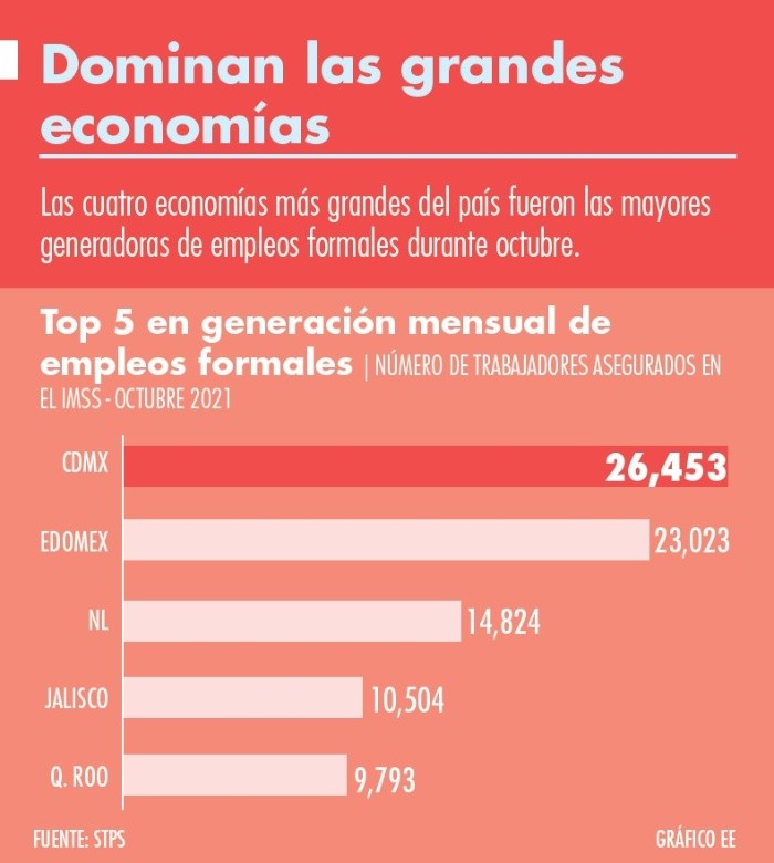 Por tercer mes consecutivo, la Ciudad de México lideró la generación de empleos formales en territorio nacional.De acuerdo con datos de la Secretaría del Trabajo, la capital del país creó 26 mil 453 trabajos asegurados en el IMSS durante octubre, respecto al mes previo, que representó 15.3% de las 172 mil 668 nuevas contrataciones que se dieron en todo el país.Este resultado significó para la economía más grande de México hilar tres meses en primer lugar: en septiembre generó 22 mil 864 plazas laborales y agosto, 21 mil 572, cifras comparadas con su respectivo periodo inmediato anterior.Resalta que la rama servicios para empresas, personas y el hogar, motor económico capitalino, es el talón de Aquiles de la Ciudad de México, ya que en el décimo mes del año presentó una pérdida de 16 mil 617 trabajos, demostrando que este sector aún no se recupera de los estragos que trajo consigo la pandemia de COVID-19.En el acumulado de los primeros 10 meses del 2021, la capital generó 64 mil 966 plazas aseguradas en el Seguro Social, ocupando el sexto lugar nacional, mientras en su comparativo anual, es decir, frente a octubre del 2020, muestra 26 mil 096 nuevas altas (posición 14).Mercado de oficinas, claveEn este contexto, la jefa de Gobierno de la Ciudad de México, Claudia Sheinbaum Pardo, aseguró que será hasta los primeros meses del próximo año que la capital del país podrá recuperar todos los empleos perdidos por la contingencia sanitaria, donde el sector de oficinas será una pieza fundamental.En conferencia de prensa, la mandataria capitalina reconoció que, pese a los esfuerzos en materia de reactivación económica, todavía hay un déficit en generación de empleos para lograr los niveles prepandemia.“Hay un sector que depende mucho de la entrada de las oficinas, particularmente que se dedica a la limpieza de las oficinas, que ahí son alrededor de 120 mil empleos que se perdieron”, dijo.A partir de diálogos con la IP, informó que la mayoría de las empresas de oficinas para los primeros meses del 2022 operarán con mayor capacidad.