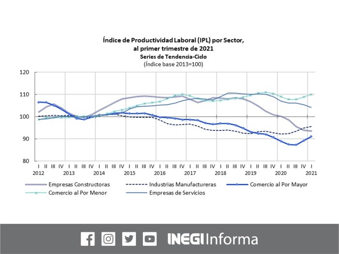 La productividad laboral en México reportó una contracción durante los primeros tres meses de 2021 respecto al trimestre inmediato anterior, informó esta mañana el Instituto Nacional de Estadística y Geografía (Inegi).Con lo anterior se acumulan tres trimestres consecutivos a la baja en la productividad de la mano de obra mexicana, en el marco de la pandemia por COVID-19.El inegi señaló que en el primer trimestre de 2021 el Índice Global de Productividad Laboral de la Economía por hora trabajada, que resulta de la relación entre el Producto Interno Bruto a precios constantes y el factor trabajo de todas las unidades productivas del país, registró un nivel de 100.9 puntos, cifra 0.7% inferior a la reportada en el trimestre anterior. De manera desagregada, los resultados del Índice Global de Productividad Laboral por grupos de actividad económica con base en las horas trabajadas fueron los siguientes: en las actividades industriales retrocedió 1.4% y en las actividades agropecuarias cayó 0.9%, mientras que en los servicios ascendió 0.4%. El Índice de Productividad Laboral se define como el cociente entre el índice del valor de la producción a precios constantes en un periodo determinado, y el índice de horas trabajadas o el índice de personal ocupado total en el mismo periodo.El Índice de Productividad Laboral con base en horas trabajadas en los establecimientos de las empresas de la construcción creció 0.5% y en los de las industrias manufactureras 0.2% en el trimestre enero-marzo del año en curso respecto al trimestre que le precede.Por su parte, el Índice de Productividad Laboral en las empresas comerciales y de servicios (definido como el índice de los ingresos reales entre el índice de personal ocupado) reportó el siguiente comportamiento: en las empresas de comercio al por mayor subió 2.7% y en las de comercio al por menor 0.9%, en tanto que en las de servicios privados no financieros disminuyó 1.4% durante el primer trimestre de 2021 frente al trimestre inmediato anterior.El Índice del Costo Unitario de la Mano de Obra, es un indicador complementario al índice de productividad laboral, el cual resulta de relacionar el costo por unidad de insumo laboral (remuneraciones medias reales), con la medida de la productividad laboral.El Índice del Costo Unitario de la Mano de Obra en los establecimientos manufactureros se redujo 0.2% y tanto en las empresas de comercio al mayoreo como en las de comercio al menudeo retrocedió 2.6%; por su parte, en las empresas de la construcción creció 2.2% y en la de servicios privados no financieros 1.3% en el trimestre enero-marzo de 2021 frente al trimestre inmediato anterior.NR