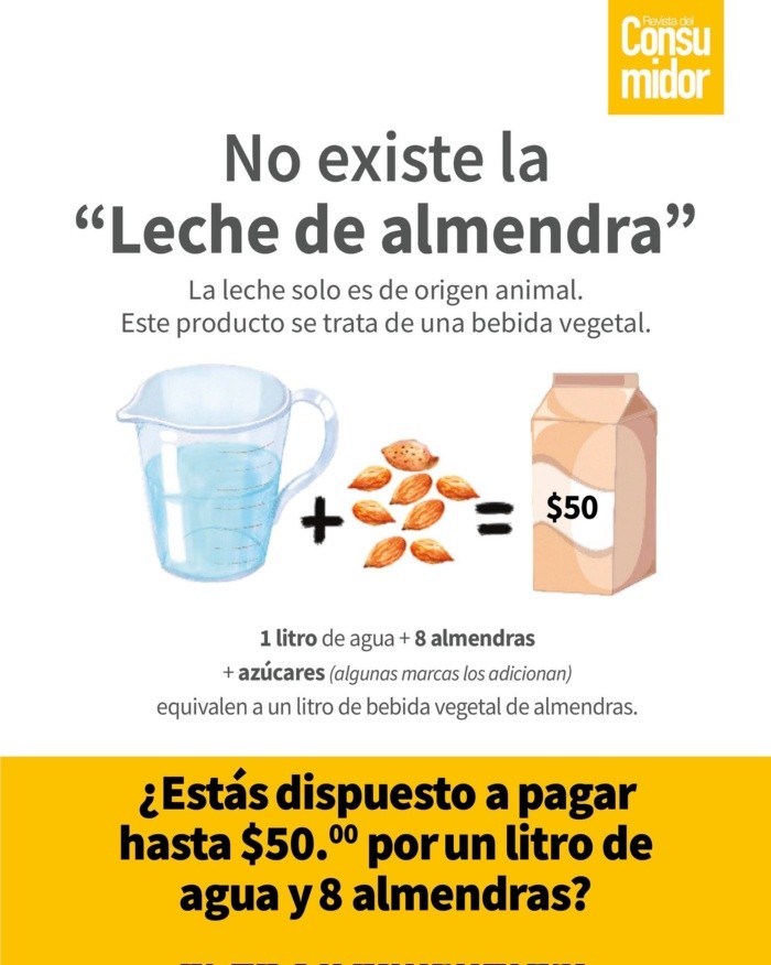 La Procuraduría Federal del Consumidor (Profeco), por medio de la "Revista del Consumidor", dio a conocer en 2019 un estudio que concluye que no existe la "leche de almendra" e invitó a reflexionar acerca de la relación entre la calidad y el precio de este tipo de productos."¿Estás dispuesto a pagar hasta 50 pesos por un litro de agua y ocho almendras?", fue el mensaje publicado por la #Revista del Consumidor# para complementar el argumento de la nula existencia de las "leches" vegetales. El mensaje también fue replicado el 16 de julio de 2022 en la cuenta de Twitter del titular de la Profeco, Ricardo Sheffield.Según el estudio realizado por el Laboratorio Nacional al Consumidor, donde se analizaron 22 bebidas vegetales, es erróneo llamar "leche" a los productos elaborados a partir de almendras, coco, soya, arroz o avena a pesar de su similitud con el producto derivado de la vaca.La Profeco asegura que llamar "leche" a productos elaborados a partir de ingredientes vegetales es un acto de publicidad engañosa, pues ninguno de estos productos contiene lactosa.En el estudio realizado en 2019 se analizó el cumplimiento de las etiquetas con la norma "NOM-051-SCFI/SSA1-2010", se confirmó que el contenido neto de los productos estudiados correspondiera al declarado en su etiqueta, se evaluaron los contenidos de la proteína, grasa y azúcares, se analizó el tipo de grasa para corroborar su origen vegetal y se confirmó la calidad sanitaria de los productos.En el caso de las bebidas elaboradas a partir de almendras, la Profeco dedujo a partir de una aproximación basada en los valores encontrados en los productos estudiados, que para elaborar un litro de "leche" de almendra se requiere únicamente de ocho unidades de este fruto seco.Además, el estudio concluye que el principal componente de las bebidas evaluadas es agua (92 al 98%), seguido de azúcares, grasas y proteínas.Como reflexión, la Revista del Consumidor invita a analizar la relación entre el precio, la calidad y el aporte nutrimental de la leche de almendra, pues este producto posee un aporte mínimo de proteína (menos de 1%) y un solo litro podría costar hasta 48 pesos.JM