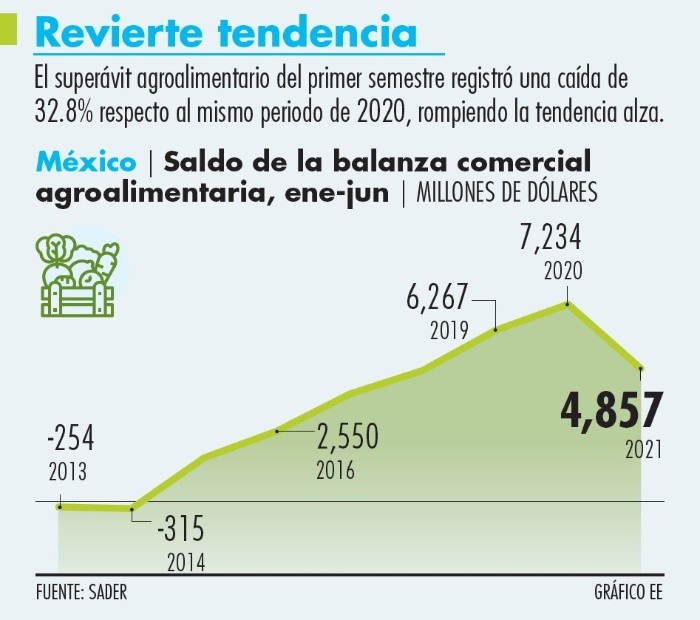 La balanza comercial agroalimentaria del país (balanza agropecuaria y agroindustrial) alcanzó un superávit de 4 mil 857 millones de dólares en el periodo enero a junio del presente año, informó la Secretaría de Agricultura y Desarrollo Rural (Sader).En su reporte la dependencia resaltó que se trata del tercer mayor saldo positivo en 27 años, derivado de 22 mil 588 millones de dólares de exportaciones agropecuarias y agroindustriales y de 17 mil 731 millones de dólares de importaciones, de acuerdo con cifras del Banco de México; no obstante, representa una caída una caída de 32.8% respecto al primer semestre de 2020.Al respecto, la Sader comentó que 2020 fue un año atípico; en tanto, Juan Carlos Anaya, director de Grupo de Consultor de Mercados Agrícolas (GCMA), destacó que en 2020 las exportaciones de granos y oleaginosas reportaron un aumento en los precios y volumen, lo que significó 7 mil 234 millones de dólares.En su reporte la Secretaría de Agricultura informó que el valor de las ventas agroalimentarias al exterior a junio de 2021 fue el más alto reportado en 29 años, lo que permitió al país obtener divisas que superan a las conseguidas por la venta de productos petroleros, en 9 mil 908 millones de dólares y turismo extranjero en 14 mil 773 millones de dólares.Así, en la primera mitad del año, el comercio total agroalimentario de México con sus socios comerciales alcanzó 40 mil 319 millones de dólares. El 56% correspondió a ventas realizadas por nuestro país. En lo referente a la balanza agropecuaria y pesquera para el periodo enero-junio de 2021, presentó un alza tanto en exportaciones como en las importaciones, derivando en un saldo positivo de mil 945 millones de dólares, no obstante el aumento en las compras.Mientras que la balanza agroindustrial presentó un superávit de 2 mil 912 millones de dólares, en los primeros seis meses de 2021, derivado de exportaciones por 11mil 844 millones de dólares e importaciones por 8 mil 932 millones de dólares. En dicho periodo, las hortalizas, bebidas y frutas fueron los principales grupos de exportación, ya que concentraron más del 63% del total, con el 21.2, 21.0 y 20.9% de participación, respectivamente.El especialista en Mercados Agrícolas comentó que las exportaciones se mantienen en un nivel superavitario gracias al sector hortofrutícola y pecuario "las importaciones aumentan por mayores compras de granos y oleaginosas un 14% en volumen y 62% en valor".Si te interesó esta noticia y quieres saber más, entonces descarga y descubre INFORMAPlus, la aplicación digital de EL INFORMADOR, en donde tenemos contenidos exclusivos, seleccionados por nuestros editores, para darles una experiencia más completa a los lectores.Descarga la aplicación y pruébala GRATIS por treinta días.Para iOS: https://apple.co/35jaVgb Para Android: https://bit.ly/3gwVSEVSi eres suscriptor de EL INFORMADOR tu acceso está incluido, solicítalo al 33 3678-7777.