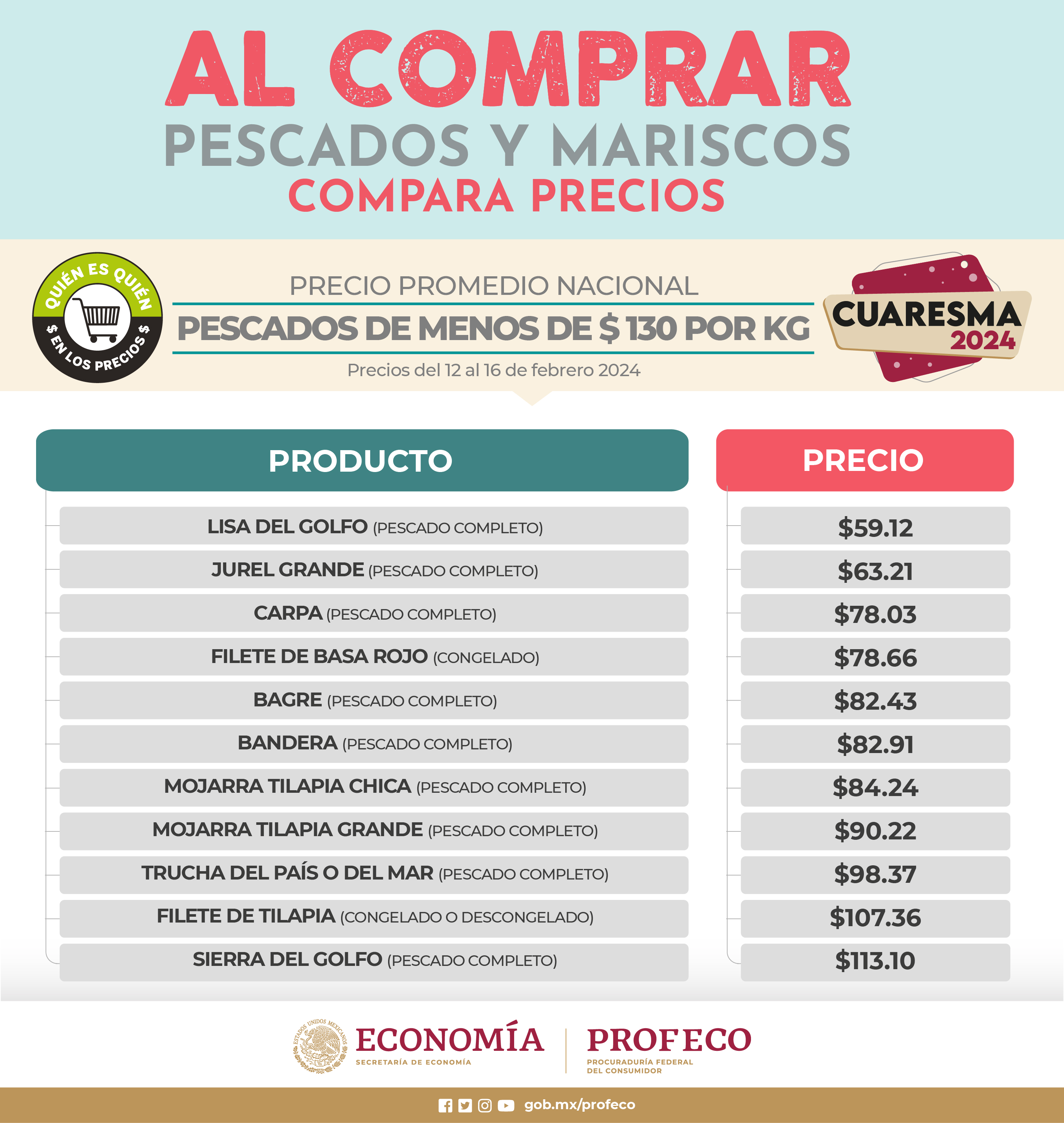Para esta temporada de Cuaresma, la Procuraduría Federal del Consumidor (Profeco) recomienda comparar precios antes de comprar pescados y mariscos. También comparte cuál es el precio promedio nacional de pescados de menos de 130 pesos por kilo, analizados del 12 al 16 de febrero, para evitar comprar productos del mar por encima de su precio habitual. *Mantente al día con las noticias, únete a nuestro canal de WhatsApp aquí: https://whatsapp.com/channel/0029VaAf9Pu9hXF1EJ561i03MV