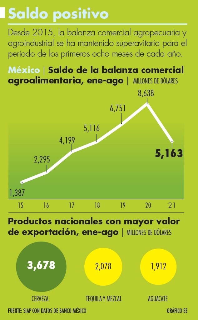 La balanza comercial agropecuaria y agroindustrial registró un superávit de 5 mil 163 millones de dólares entre enero y agosto de este año, informó la Secretaría de Agricultura y Desarrollo Rural (Sader). Si bien este dato se ubicó como el tercer mayor saldo positivo en 27 años (para un mismo periodo), significó también una caída de 40.2% respecto al mismo periodo de 2020 (8 mil 638 millones de dólares).La caída se explica, en parte, debido a que las importaciones registraron un mayor dinamismo que las exportaciones este año: las compras al exterior fueron por 24 mil 226 millones de dólares (un crecimiento de 38.8%), mientras que los envíos ascendieron a 29 mil 390 millones de dólares (12.6% más en los primeros ocho meses del año).De acuerdo con Banxico, la dependencia federal resaltó que la dinámica que presentan las exportaciones de bienes agroalimentarios permite al país obtener divisas que superan a las conseguidas por la venta de productos petroleros en 11 mil 256 millones de dólares (62.1%) y turismo extranjero en 17 mil 549 millones de dólares (148.2 por ciento).Refirió que, en los primeros ocho meses del año, el comercio total agroalimentario de México con sus socios comerciales alcanzó 53 mil 616 millones de dólares.En la balanza agropecuaria y pesquera para enero-agosto de 2021, presentó un saldo positivo de mil 198 millones de dólares, con ventas por 13 mil 229 millones de dólares y compras al exterior por 12 mil 031 millones de dólares, pese a un mayor aumento en estas últimas.En cuanto a productos agroindustriales, registraron el mayor crecimiento las exportaciones de aceite de soya, con 192.21%; carne y despojos de aves de corral, 189.49%; sopas, potajes o caldos, 60.97%; tequila y mezcal, 40.94%, y aguas y refrescos con alza de 40.81 por ciento. Mientras los productos nacionales con mayor valor de exportación fueron: cerveza, con 3 mil 678 millones de dólares; tequila y mezcal, con 2 mil 078 millones de dólares y aguacate, mil 912 millones de dólares.La Sader anotó que, en los primeros ocho meses del año, más de 57% de las importaciones se concentran en cuatro grupos: cereales, con 21%; semillas y frutos oleaginosos, con 15%; cárnicos, con 15%, y lácteos, huevos y miel, con 6 por ciento.