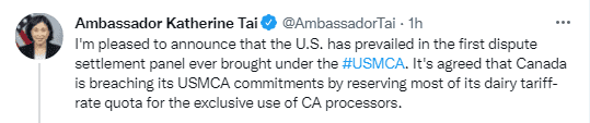 Estados Unidos anunció este martes que le ganó a Canadá un litigio sobre las cuotas lácteas canadienses, esta es la primera disputa del Tratado de Libre comercio de América del Norte (T-MEC). El grupo que se formó en mayo del 2021 para resolver el desacuerdo, consideró que las cuotas lácteas que adoptó Canadá van en un sentido contrario a lo que se ha previsto en el acuerdo, así se afirmó en un comunicado, por Katherine Tai, quien es representante de Comercio de los Estados Unidos después de la victoria del presidente Joe Biden.DO