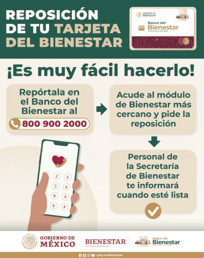 Los programas del Bienestar del Gobierno federal están migrando sus cuentas de los bancos comerciales al Banco del Bienestar. Algunos más, llegan a los beneficios ya con un plástico original de la institución financiera oficial y, ante esto, es importante recordar qué se debe hacer si, eventualmente, el plástico es extraviado.En caso de robo o extravío, el usuario deberá comunicarse a la línea del Banco del Bienestar: 800 900 2000, opción 2 y luego 1. En la llamada, solicitarán los siguientes datos: Durante la llamada se otorgará un folio de seguimiento para dar continuidad al proceso de reposición de la tarjeta que será solicitado en la ventanilla de la sucursal de adscripción, indicada en el contrato de cuenta. El Gobierno de México pidió a los usuarios recordar que la tarjeta del Bienestar es el medio por el que se recibirá el recurso de la Beca Benito Juárez, así que es muy importante cuidarla en todo momento. OA