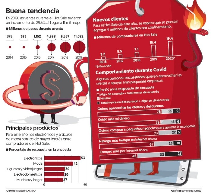 Mañana arranca la séptima edición del Hot Sale 2020, que al igual que el Cybermonday ofrece descuentos en sitios de comercio electrónico, aunque para este año se prevé que el ticket de compra caerá 48 por ciento, al pasar de 5 mil a solo 2 mil 600 pesos, pese a que siete de cada 10 internautas ya tienen planeada alguna compra, de acuerdo la Asociación Mexicana de Venta Online (AMVO) y Tiendeo. “De acuerdo con la encuesta aplicada a usuarios de la plataforma, 72 por ciento de los mexicanos sí comprará en este Hot Sale, aunque como era de esperarse 74 por ciento destinará mucho menos presupuesto este año”, indicó Tiendeo. En una encuesta AMVO encontró que 76 por ciento de los consumidores cuidará más su dinero y el destino de éste. El Hot Sale, que se celebrará del 22 de mayo al 1 de junio, tiene entre sus objetivos el cautivar a 4 millones de nuevos compradores, el doble del año pasado, esto derivado del confinamiento en los hogares, lo que ha impulsado el comercio electrónico con compras básicas de despensa. A diferencia de años previos, en las promociones de esta campaña las cadenas de autoservicio Chedraui, Soriana y Walmart, se saldrán de la cotidianidad de electrónica y línea blanca para sumar a los abarrotes ante la demanda por el confinamiento. En tanto, eBay, Coppel y Mercado Libre se concentran en fuertes descuentos, mejorar los tiempos de entrega, y envíos gratis, respectivamente. Abarrotes llegan al Hot Sale Por el miedo al contagio y el llamado al confinamiento en los hogares tres de cada 10 consumidores ya realizan el súper desde el comercio electrónico, muestran datos de Nielsen, una oportunidad de descuento que observan los retailers. “Regularmente en el Hot Sale entran productos de electrónica y mercancías generales, en cuanto a abarrotes y perecederos, no es común que participen, por el momento, me confirman que sí habrá algunas promociones en ciertos productos de abarrotes”, adelantó Chedraui en correo electrónico a El Financiero. Por su parte, Walmart de México confirmó que además de electrónica, línea blanca y videojuegos, se incluirán abarrotes, consumibles y químicos en los descuentos que pondrán en sus cadenas Walmart, Bodega Aurrera y Sam’s Club. La empresa resaltó que por motivos del Hot Sale las compras en Sam’s Club podrán hacerse sin membresía, además de tener la opción de envío a domicilio o recoger en tienda. En tanto, Soriana pretende aprovechar la curva de interés por el comercio electrónico, enfocándose en descuentos de categorías que no son permanentes como electrónica, línea blanca y ferretería. “El año pasado crecimos en triple dígito tanto en ventas como en volumen de clientes, este año se ha acelerado por la situación del COVID-19 y creemos que creceremos a esos mismos números”, declaró Rafael Castelltort, director de e-commerce de Soriana. Mercado Libre va por envíos gratis Mercado Libre registra un incremento del 79 por ciento de nuevos compradores desde el inicio de la pandemia en México, por lo que ahora en Hot Sale buscará acelerar la curva con envíos gratis durante el Hot Sale. “Estamos cerrando acuerdos con los principales bancos para ofrecer meses sin intereses y envíos gratis y rápidos a todo el país, en compras que van desde los 499 pesos”, adelantó David Geisen, director general de la plataforma en México. Refirió que en las ediciones del Hot Sale han mantenido crecimientos de doble dígito, donde destacó que en 2019 tuvieron 7.8 millones de visitas diarias. “Este año, esperamos un incremento de nuevos compradores en función del crecimiento que estamos teniendo frente al contexto actual”, expuso el directivo. Coppel quiere bajar tiempo de entrega Coppel mantiene un promedio de entrega de entre cinco y ocho días, tiempo que pretende mejorar con inversiones en logística. “Estamos habilitando más bodegas de envíos en puntos estratégicos del país, además del desarrollo de nuevas tecnologías para el manejo de nuestros inventarios en tiempo real”, dijo Bernardo Bazúa, director Omnicanal y Digital de Grupo Coppel. Señaló que en los canales del sitio y la aplicación móvil presentan un alza de 300 por ciento en el tráfico, por lo que aprovechan para impulsar y hacer 100 por ciento digitales sus servicios financieros, que el año pasado representaron la mitad de todas las transacciones de la edición. “Identificamos un crecimiento de más de 60 por ciento en los clientes que compraron por primera vez en nuestra plataforma, respecto al 2018, y un crecimiento en la recompra del 150 por ciento, por lo cual para este año esperamos continuar con esa tendencia”, concluyó el directivo. eBay, hasta 70% de desuento y envíos a seis dólares La plataforma de comercio electrónico eBay pondrá descuentos hasta de 70 por ciento en los 10 mil artículos con los que participará en Hot Sale. “Además de las ofertas, vamos a tener una tarifa especial por Hot Sale, que es de seis dólares como costo de entrega con Estafeta, cuando suele ser de 10 dólares”, anunció Juliana Camargo, líder de marketing y mercadotecnia de eBay América Latina.