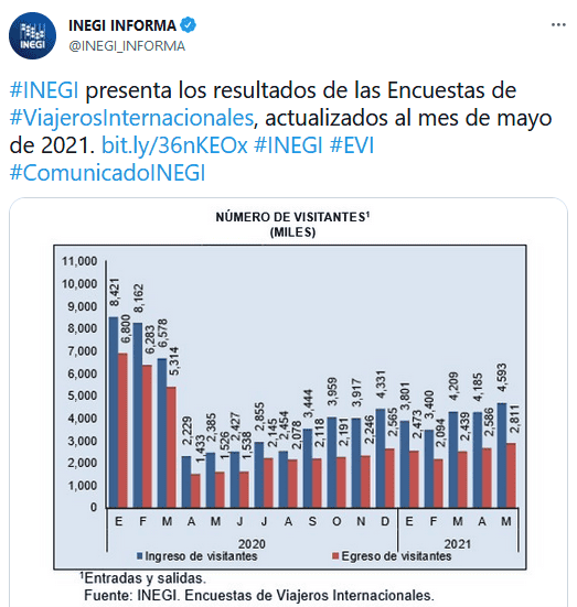 México recibió en mayo un 198.5% más de turistas internacionales que en el mismo mes de 2020, cuando hubo confinamiento en buena parte del mundo debido a la pandemia del COVID-19, según informó este viernes el Instituto Nacional de Estadística y Geografía (Inegi).México pasó de recibir 890 mil 642 turistas extranjeros en mayo del 2020 a casi 2.66 millones en el mes de mayo pasado.No obstante, si la cifra se compara con los 3.46 millones del quinto mes de 2019 se observa todavía una sustancial caída de casi 23.2 por ciento."En mayo 2021 ingresaron a México 2.7 millones de turistas internacionales, flujo que se compara con 891 mil en mayo 2020 (+198.5 %) y con 3.4 millones en mayo 2019 (-23.2 %). Por vía aérea ingresaron 1.2 millones en mayo 2021, 36 mil en mayo 2020 y 1.5 millones en mayo 2019", dijo en Twitter el presidente del Inegi, Julio A. Santaella.El principal repunte se dio en los turistas llegados por vía aérea, que en mayo del año anterior representaron apenas 36 mil 210 personas y en el mismo mes de 2021 fueron más de 1.22 millones de viajeros, un dato que se multiplica por más de 32.Los turistas fronterizos subieron un 54.1 % interanual en mayo hasta llegar a los 1.15 millones de viajeros.Los datos responden a la pandemia del COVID-19, una enfermedad que hasta el momento ha dejado más de 2.5 millones de contagios y casi 235 mil decesos en México, uno de los países más afectados del mundo.En mayo de 2021, el ingreso de divisas se disparó un 931.5 % interanual al pasar de 154.3 millones de dólares a mil 591.7 millones de dólares de gasto total.No obstante, si se compara el dato de mayo pasado con el del mismo mes de 2019 la caída es todavía del 17.9 por ciento.El gasto medio de cada turista subió interanualmente al pasar de 61.1 dólares en mayo de 2020 a 181.7 dólares en el quinto mes del presente año, un 197.3% más.Significativamente, el gasto medio del turista en 2021 es incluso mayor en casi 67% frente a los datos de 2019, cuando fue de 108.95 dólares.El 1 de junio del 2020 arrancó en México la llamada "nueva normalidad" con una apertura económica y social por fases y muy cautelosa tras dos meses de una emergencia sanitaria que paralizó las actividades no esenciales.La industria turística mexicana, que aporta el 8.7 % del producto interior bruto (PIB), no se recuperará por completo hasta 2023, según las estimaciones de Miguel Torruco, secretario de Turismo.Aun así, México fue el tercer país más visitado en el mundo en 2020, según las estimaciones de la Organización Mundial del Turismo (OMT), un fenómeno coyuntural que se atribuye a las medidas sanitarias flexibles en las zonas turísticas del país.México se consolidó en 2019 como uno de los 10 países más visitados del mundo con más de 45 millones de turistas internacionales, que dejaron 24 mil 563 millones de dólares, un crecimiento de 9% anual.GC