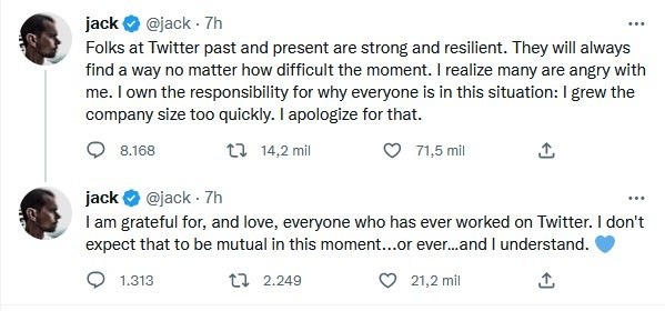 Jack Dorsey, cofundador y exdirector ejecutivo de Twitter, pidió disculpas el sábado al personal de la empresa por hacer crecer "demasiado rápido" la red social, un día después de que el nuevo propietario, Elon Musk, despidiera a aproximadamente la mitad de los siete mil 500 empleados."Me doy cuenta de que muchos están enojados conmigo", escribió Dorsey, quien cofundó Twitter en 2006 y renunció como director ejecutivo el año pasado."Soy responsable de que todos estén en esta situación: aumenté el tamaño de la empresa demasiado rápido. Me disculpo por eso", dijo en Twitter.Muchos empleados de Twitter estaban esperando que su exjefe, una figura carismática e influyente en Silicon Valley, reaccionara después de que Musk, el hombre más rico del mundo, tomó el control de la plataforma hace una semana en un polémico acuerdo de adquisición.En una publicación de Twitter en abril, Dorsey había respaldado la compra por parte de Musk, calificándola como "el camino correcto"."La gente del pasado y del presente de Twitter es fuerte y resiliente", escribió Dorsey el sábado. "Siempre encontrarán un camino por difícil que sea el momento".Dorsey dejó su cargo como director ejecutivo de Twitter en noviembre de 2021 y abandonó la junta directiva en mayo pasado, pero sigue siendo accionista indirecto de la empresa.JM