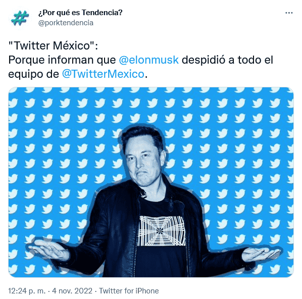 Este viernes 4 de noviembre han circulado noticias sobre el recorte que el nuevo propietario de la red social de Twitter, Elon Musk, hizo en todo el mundo, lo que incluye a los trabajadores de la sede en México. Según reportes en Internet, toda la plantilla laboral en el país habría sido despedida.Han sido diferentes usuarios los que han señalado en redes sociales que Elon Musk despidió a todos los empleados de Twitter México, situación que se volvió tendencia en la red social del ave azul.Twitter anunció hoy el despido de "cerca del 50%" de sus siete mil 500 empleados en todo el mundo."Cerca del 50% de la fuerza laboral se verá afectada", indica un correo electrónico que habría sido enviado a los afectados, y que fue difundida por agencias como AFP.Según indican, a los trabajadores les habrían pedido en una llamada telefónica que se quedaran en su casa este día, en espera de que les llegara un correo con la notificación de si perdían su puesto, en plena reestructuración de la plataforma recién adquirida por 44 mil millones de dólares.El último mensaje que la cuenta @TwitterMexico publicó fue una serie de sugerencias de series o películas para ver el fin de semana, en el marco del Halloween y el Día de Muertos.La situación de Twitter México no ha sido confirmada hasta el momento.OF