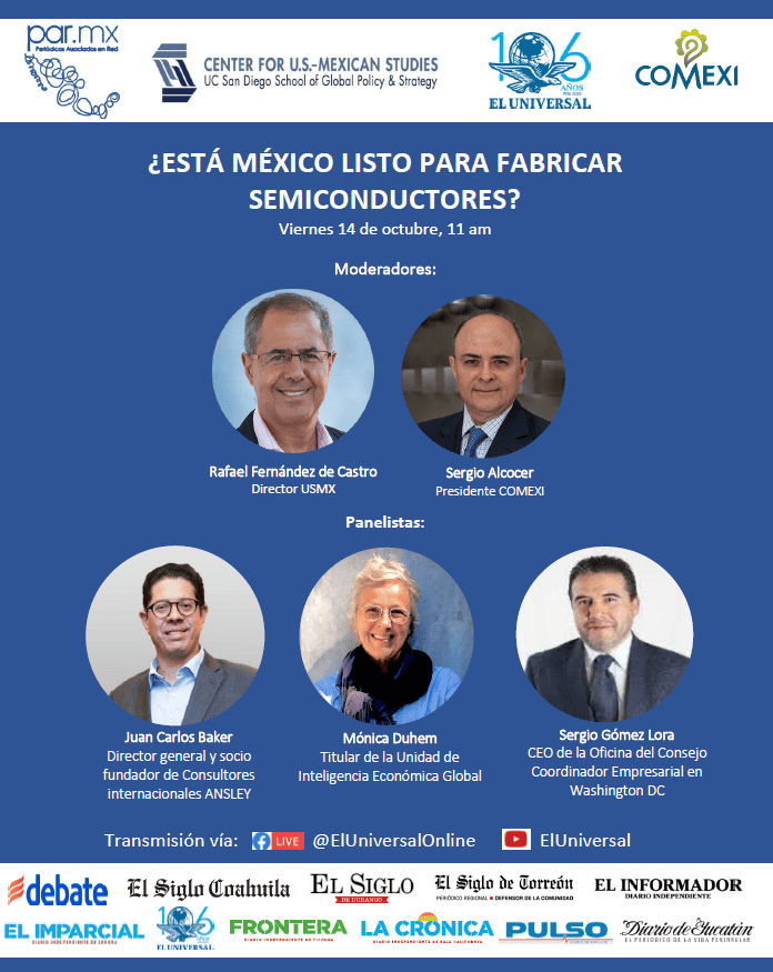 Este viernes 14 de octubre, en punto de las 11:00 horas, el Foro de Periódicos Asociados en Red (PAR) comienza el panel: "¿Está México listo para fabricar simiconductores?"Esta conversación puede seguirse a través de la página de EL INFORMADOR en tiempo real y es moderada por Rafael Fernández de Castro, director de USMX y Sergio Alcocer, Presidente de COMEXI.En el foro participan, además, Juan Carlos Baker, director general y socio fundador de Consultores Internacionales ANSLEY; Mónica Duhem, titular de la Unidad de Inteligencia Económica Global y Sergio Gómez Lora, CEO de la Oficina del Consejo Coordinador Empresarial en Washington DC.OA