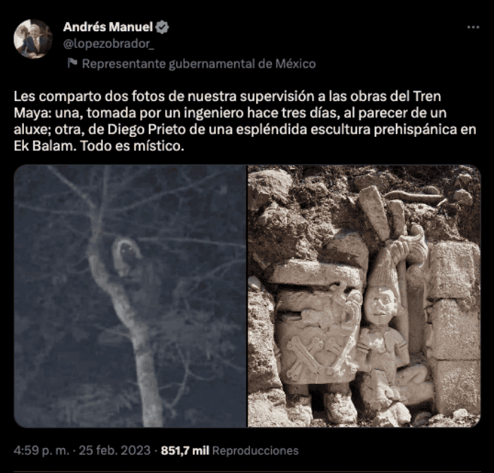 Andrés Manuel López Obrador, Presidente de México, ocasionó un escándalo luego de haber compartido una imagen de un supuesto "aluxe" -una criatura mítica de la cultura mexicana- encontrado en los territorios donde transitará el Tren Maya. “Les comparto dos fotos de nuestra supervisión a las obras del Tren Maya: una, tomada por un ingeniero hace tres días, al parecer de un aluxe; otra, de Diego Prieto de una espléndida escultura prehispánica en Ek Balam. Todo es místico”, escribió López Obrador en su publicación.La publicación ha generado todo un estallido de críticas, burlas y reacciones en las redes sociales, pues hay usuarios que afirman que la supuesta imagen del "aluxe" rondaba desde hace varios años en internet. El mensaje de López Obrador adquirió tal alcance, que incluso medios internacionales replicaron la polémica. Esta mañana, se hizo viral la reacción de Stephen Colbert, uno de los conductores y comediantes más populares de los Estados Unidos, el cual no tuvo ningún reparo en burlarse de López Obrador. Durante su show nocturno, Colbert mostró la imagen del supuesto "aluxe", refiriéndose a este como un elfo. "¿Es así como los elfos se ven en México?", se pregunta el conductor, en medio de las risas de la audiencia. "Es el Presidente de México, quién soy yo para juzgar", dice. Acto seguido, muestra un video editado en el que supuestamente López Obrador se dirige al pueblo de México, donde afirma que tuvo un encuentro con el "elfo" -que en el video se muestra como un simple mapache-, el cual le dio "un beso con sus dientes". López Obrador indica entonces que cree que el elfo "le transfirió un poco de su magia". El video termina con el Presidente de México babeando espuma, como si tuviese rabia. El video ha generado toda clase de reacciones en las redes sociales. Hasta ahora, López Obrador no se ha pronunciado al respecto. FS y modificó un video