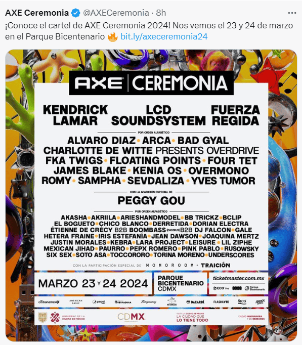 AXE ceremonia es un festival cultural que, de acuerdo a su página oficial, cuenta "con lo mejor y más representativo de la escena local e internacional en un solo fin de semana".Este es un festival mexicano aclamado por su dedicación a la diversidad musical y se está preparando para cautivar a todos sus asistentes en la edición 2024, por lo que a través de sus redes sociales ha revelado el cartel oficial con los asistentes.El show estará encabezado por Kendrick Lamar, noticia que y había sido dada a conocer previamente, asimismo destacan los nombres de las siguientes agrupaciones: LCD Soundsystem y Fuerza Regida.AXE ceremonia se llevará a cabo los días 23 y 24 de marzo de 2024 con sede en el Parque Bicentenario, lugar emblemático de este evento cultural y musical; las entradas las podrás adquirir a través de ticketmaster.com.mx.Sigue al día con las noticias, únete a nuestro canal de WhatsAppYC