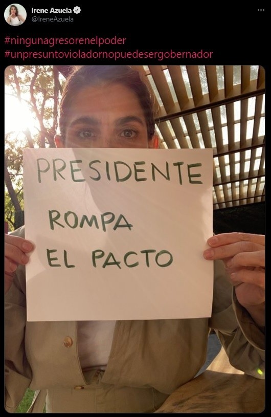 La postulación de Félix Salgado Macedonio a la gubernatura de Guerrero y la postura del Presidente Andrés Manuel López Obrador al respecto provocó que varias actrices publicaran imágenes en sus redes sociales con una frase: Presidente, rompa el pacto, refiriéndose al pacto patriarcal.Cuando le preguntaron al presidente sobre la candidatura del integrante de Morena mientras que existen denuncias de acoso sexual en su contra, contestó que hay que tenerle confianza al pueblo y que la gente es la que decide, por lo que pidió respetarla.Con "hashtags" como "#NingúnVioladorSeraGobernador" y "#NingúnAgresorEnElPoder", Regina Blandón colocó una imagen sosteniendo una hoja blanca con la frase "Presidente, rompa el pacto".La actriz Irene Azuela también se pronunció en sus redes sociales con el "hashtag" "#unpresuntovioladornopuedesergobernador". Azuela hizo algunas publicaciones en las que lamentó la actitud del presidente."Qué lamentable la respuesta del presidente López Obrador acerca del tema de Félix Salgado y las denuncias por abuso sexual. 'Hay que escuchar al pueblo', dice. Sí. Pero acuérdese que el pueblo también son las mujeres…". También consideró como una pena que el presidente "no sepa que la mayoría de los actos violentos sexuales hacia las mujeres suceden en espacios cerrados y son difíciles de comprobar....".La actriz María Aura también publicó en su cuenta de Instagram, "Señor presidente, #rompaelpacto, no avale el abuso a las mujeres desde el poder, ponga el ejemplo y cuídenos".Itzel Enciso, actriz y directora, publicó su fotografía sosteniendo el mismo cartel pero con otro mensaje acompañando la publicación."Yo soy mujer, mi voz también suena y no quiero gobernadores que estén acusados de abuso sexual. ¿Por qué querría a una persona que objetualiza a una mujer? ¿Por qué querría como gobernador quien en este sistema de poder abusa de una mujer? No, no es politiquería, es una convicción. Que para la agenda presidencial no sea importante, no significa que lo mire del mismo modo".Maya Zapata no se quedó atrás y escribió que la indiferencia del presidente era dolorosa."Con base en las declaraciones del presidente @lopezobrador en el espacio de La Mañarera nos pronunciamos en contra de su poca empatía, su nulo compromiso para atacar el complejo problema del abuso sexual en la infancia, adolescencia y adultez y que afecta en mayor medida a las mujeres".El director Benjamín Cann también se unió a las voces de actrices y subió su fotografía a redes sociales, con el "hashtag" "#PresidenteRompaElPacto".Marina de Tavira también compartió una imagen en redes sociales donde se unió a la voz de sus compañeras. “Por qué no escuchar la voz de las denuncias?”, escribió.“Hay cosas que nos tendrían que hacer detenerlo todo, investigar a fondo y no brincar a conclusiones. Hay cinco testimonios que deberían ser escuchados”, agregó.AC