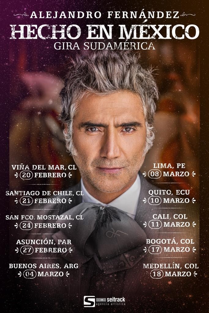 La esencia y folclor mexicano está por regresar a la Quinta Vergara y será con la voz de Alejandro Fernández, pues el cantante tapatío ha confirmado su próxima presentación en el afamado festival de Viña del Mar, como parte de su gira “Hecho en México” que extenderá sus presentaciones en Sudamérica el próximo año.Considerado como uno de los íconos más destacados del ranchero a nivel mundial, Alejandro Fernández dará inicio a su recorrido por Sudamérica el próximo mes de febrero marcando su primera presentación en uno de los escenarios latinoamericanos más importantes: el Festival Internacional de la Canción de Viña del Mar, en Chile, que alista cada detalle para su próxima edición 2023.De acuerdo a su equipo de producción, Alejandro Fernández se instalará en la Quinta Vergara con un espectáculo completo para hacer un recorrido puntual por toda su trayectoria y sus éxitos más emblemáticos, acompañándose en el escenario por más de 20 músicos que también ahondarán en su faceta más pop y sus ya conocidas baladas.Su gira “Hecho en México” por Sudamérica 2023, contempla presentaciones, tras su arranque el 20 de febrero en Viña del Mar, en los siguientes forosCon la gira “Hecho en México”, Alejandro Fernández ha recorrido países como Estados Unidos, México, Colombia, Costa Rica, Guatemala, Venezuela, Honduras, República Dominicana, y ahora sumará a Sudamérica en el 2023.Con más de 35 millones de discos vendidos a nivel mundial y múltiple ganador de varios premios Grammy, actualmente Alejandro Fernández mantiene en promoción su más reciente lanzamiento discográfico “Hecho en México Edición Especial”, versión deluxe de su último álbum que incluye tres nuevas canciones: “No prenderé la luz”, “Ibas de salida” y la versión mariachi de “No lo beses”.Alejandro Fernández presentó hace unos meses el sencillo “Amor tumbado” al lado de Natanael Cano y “Mariposa traicionera” a dueto con Maná, y alcanzó la posición número uno, tanto en el chart de Regional Mexicano de Billboard como en el chart de Popular de Monitor Latino con “Nunca dudes de llamarme” al lado de La Arrolladora Banda El Limón, que acumula más de 7 millones de streams en Spotify.Este disco lo convirtió en el primer artista en alcanzar el número uno del listado de Top Álbumes Latinos de Billboard en cuatro décadas distintas—1990, 2000, 2010 y 2020.MF
