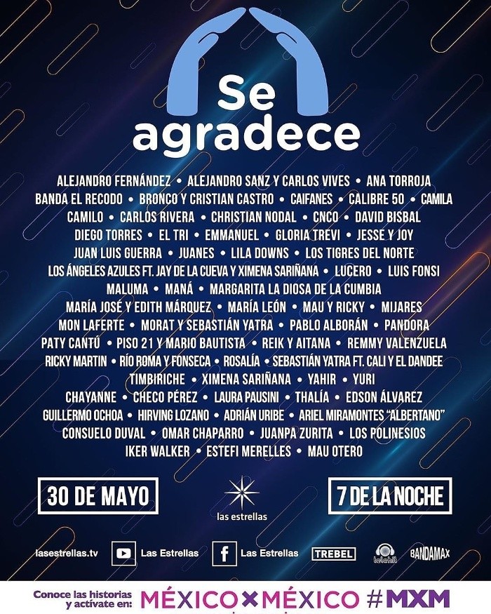El próximo sábado 30 de mayo se realizará la emisión "Se agradece" en punto de las 19:00 horas a través del canal Las Estrellas, pero también se podrá ver simultáneamente por Univisión, Telehit, Bandamax y las cuentas de Facebook y YouTube de Televisa.El programa producido por Miguel Ángel Fox, bajo la conducción de Javier Poza y la locución de Paola Rojas, durará cuatro horas sin cortes comerciales, sin fines de lucro y tampoco recibirá donaciones, ya que la intención del especial será solo para darle las gracias a todo el personal médico, de limpieza y demás piezas claves que han sido el soporte de todos los enfermos a causa del COVID-19.Sin embargo, el programa está haciendo alianza con mexicoxmexico.org/, un movimiento que genera iniciativas y cuenta historias de personas que están ayudando en estos días de confinamiento.La velada del sábado contempla la participación de más de 100 talentos entre celebridades, cantantes, deportistas, youtubers y tiktokers.Habrá musicales, mensajes de apoyo y momentos de comedia. Una de las figuras más representativas del evento virtual será Alejandro González Iñárritu, quien precisamente quiere darle las gracias a todo ese personal que solventa a los médicos y enfermeras, aquellos que nadie ve, pero que son indispensables en el manejo que se le está dando a esta pandemia en México.Figuras como Thalía, Rosalía, Maluma, J Balvin, Ricky Martin, Lila Downs, Los Tigres del Norte, Caifanes, Camila, Ana Torroja, Yahir, Carlos Rivera, Camilo, Alejandro Fernández, Alex Fernández, OV7, Maná, Cristian Castro, Bronco, Christian Nodal, Alejandro Sanz, Carlos Vives, Reik, Aitana, Los Ángeles Azules, Morat, Sebastián Yatra, Timbiriche, Piso 21, Pablos Alborán, Mario Bautista, Laura Pausini y Banda El Recodo, estarán ofreciendo música y mensajes de aliento.A ellos también se suman Juanpa Zurita, Los Polinesios, Iker Walker, Estefi Mereles, Mau Otero, Consuelo Duval, Omar Chaparro, Ariel Miramontes, Adrián Uribe, Guillermo Ochoa, Hirving Lozano, Checo Pérez, Edson Álvarez y los cantantes Gloria Trevi, Yuri, Pandora, Chayanne, Ximena Sariñana, Cali y El Dandee, Río Roma, Fonseca, Paty Cantú, Mon Laferte, María José, Edith Márquez, Mijares, Mau y Ricky, María León, Margarita La Diosa de la Cumbia, Maná, Jay de la Cueva, Lucero, Luis Fonsi, Juanes, Juan Luis Guerra, Emmanuel, Diego Torres, CNCO, El Tri, Calibre 50 y Jesse & Joy.jb