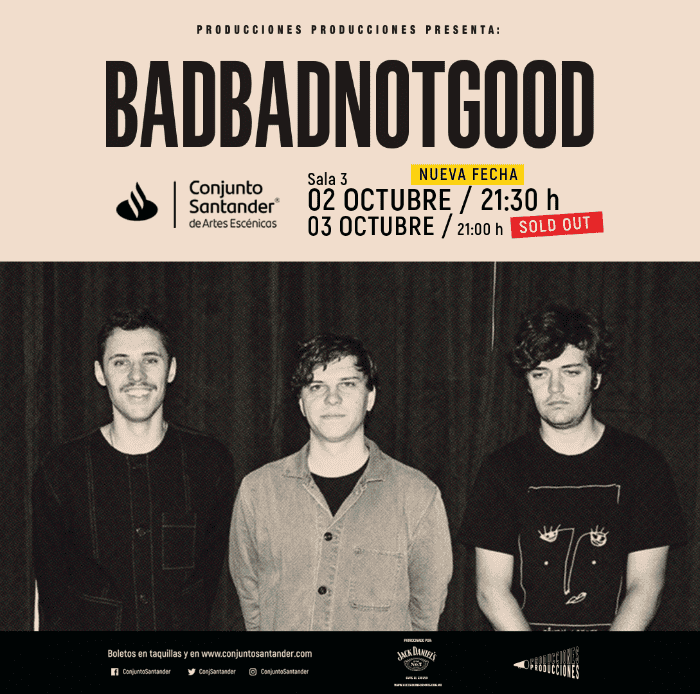 Después de agotar las entradas en pocos días, el grupo de jazz BadBadNotGood confirmó una segunda fecha en Guadalajara.La agrupación de Toronto integrada por Mathew Tavares, Chester Hansen, Alexander Sowinski y Leland Whitty, se presentarán el 2 de Octubre en la Sala 3 del Conjunto Santander.BadBadNotGood es el mayor proyecto de jazz en la música popular actual. Como una combinación explosiva, la banda ha mezclado su síncopa, soul y funk con Kendrick Lamar, Frank Ocean, Rihanna, Drake, Kaytranada, Mac Miller, Tyler, the Creator, entre otros; regresando al género la popularidad que merece. Aunque BadBadNotGood no ha lanzado un álbum desde el IV de 2016, la agrupación de Toronto se ha mantenido ocupada produciendo para otros artistas y manteniendo una programación repleta de actuaciones en vivo, incluyendo una presentación en el debut de Virgil Abloh para Louis Vuitton en la Semana de la Moda de París.AGENDA:Fecha: 2 de Octubre 2019 Lugar: Conjunto Santander (Sala 3 - General / De pie)Precios: Preventa General $620 Día del evento $700Boletos:*En línea: conjuntosantander.com/eventos/Musica*En taquilla del Conjunto Santander:Lunes a Viernes de 10am a 8pm Sábado de 11am a 7pm Domingo de 11am a 5pm