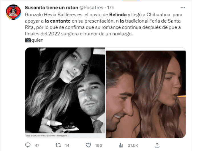 Luego del episodio por el que pasó la cantante Belinda tras su ruptura con el intérprete Christian Nodal, el corazón de Belinda palpita nuevamente. Pero esta ocasión, se trata del empresario Gonzalo Hevia Baillères el cual ha tenido éxito en prender una llama de amor en la famosa cantante. Los primeros rumores que estaban circulando sobre la pareja fueron en septiembre del año pasado, cuando ambos fueron captados en algunos eventos, incluso la revista “Quién” se encargó de confesar este romance. Acorde a la publicación Hevia, el empresario abordó un avión con destino a Chihuahua, mismo lugar, donde la famosa Belinda se presentará en unas horas, además de tener la compañía de su suegra, Belinda Schüll.Él decidió llegar a esa ciudad para acompañar a la artista pop en la presentación que será llevada a cabo en la tradicional “Feria de Santa Rita”, una fiesta muy grande en el estado de Chihuahua. Asimismo, Belinda y Gonzalo el año pasado se conocieron, saliendo al ojo público varios videos donde estaban juntos conviviendo con familia y amigos cercanos a él. Gonzalo Hevia Baillères , es parte de una de las familias más ricas de México. De hecho, el 2022 fueron posicionados como el cuarto clan (más rica) del país, según Forbes.Inclusive, el amado de Belinda es hijo de Tere Baillères (la hija más chica) del Sr. Alberto Baillères, dueño de Palacio de Hierro al igual que doña Teresa Gual."Hevia se ha vuelto una de las promesas más jóvenes del mundo de los negocios, a pesar del éxito de sus familiares". Es fundador y Ceo de Lok, un emprendimiento enfocado en la movilidad y logística que busca procrear nuevas alternativas, como: lockers inteligentes en diferentes locaciones para otorgar a empresas y usuarios una manera más competente y segura de entregar, recibir y devolver compras realizadas en virtual.En otros datos, la misión de la empresa es convertirse en una red de estructura inteligente más amplia de América del Norte y Sur, indican algunos medios de circulación nacional. SN
