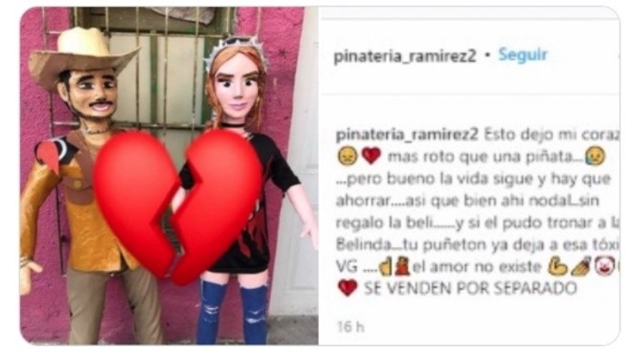 La tienda mexicana "Piñatería Ramírez" lo volvió a hacer. El negocio se subió a la tendencia de la ruptura amorosa entre Belinda y Nodal y volvieron a lanzar las piñatas de los cantantes.El estableciemiento que se ubica en Reynosa demostró que siempre están en tendencia y esta vez aprovecharon el rompiento de la pareja para lanzar sus peculiares productos.A través de sus redes sociales publicaron una imagen de las piñatas y se lee: “Esto dejó mi corazón más roto que una piñata… Pero bueno la vida sigue y hay que ahorrar…. A que bien ahí Nodal..sin regalo la Beli…… y si él pudo tronar a la Belinda…tu ya deja a esa tóxica. Se venden por separado “.Sin embargo, la tienda ya había lanzado las piñatas en 2020, cuando se dio a conocer la relación entre los intérpretes e inlcuso se mofaron y también incluyeron la piñata de Lupillo Rivera.La Piñatería Ramírez ha ganado miles de seguidores por su talento en hacer piñatas de los distintos personajes que están en tendencia. En su cuenta oficial de facebook tienen a más de 170 mil seguidores y en Instagram cuentan con más 20 mil.Tras la noticia de la separación de Belinda y Nodal, muchos han aprovechado y se han subido a la tendencia, entre ellos Mistercumbia que creó la letra y compuso la música de una cumbia que desde el domingo pasado ya estaba en redes."Llegué a casa, vi todo lo que estaba pasando y no me dormí sino hasta que estuvo armada", dice vía telefónica el artista mexicano, pero radicado en Estados Unidos.La letra de Belinda y Nodal comienza narrando cómo el artista se enteró del rompimiento entre ambos cantantes. Contabiliza cerca de 6 mil visualizaciones.La noche del sábado 12 de febrero Nodal anunció el fin de su relación a través de sus redes sociales."Cada uno vivirá su proceso de separación a su manera y siempre deseándole lo mejor el uno al otro por los tiempos felices vividos y los de prueba también", escribió Nodal.jb