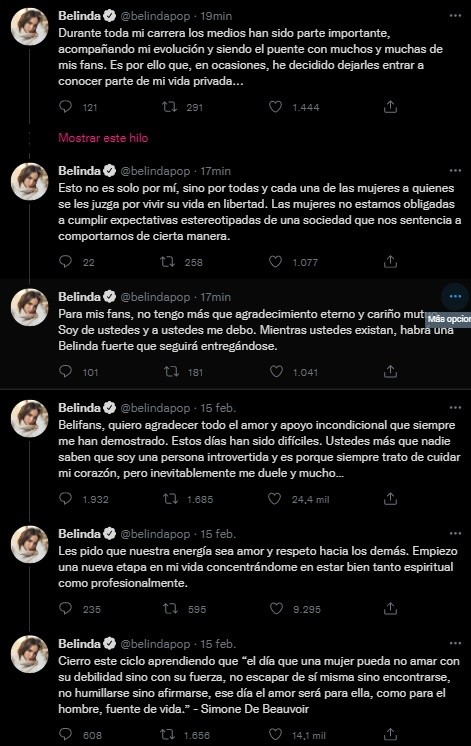 El fin de semana pasado Christian Nodal avisó en su cuenta de Instagram que la relación sentimental con Belinda había terminado, desarrollándose todo tipo de rumores y conspiraciones sobre las causas del rompimiento. Y aunque el cantante pidió respeto y que no se especulara, las cosas no han sucedido así. En redes sociales se han publicado memes que aluden a que a Belinda le interesa el dinero, comparándola incluso con el personaje del documental “El Estafador de Tinder”, además hay otras publicaciones sobre si Nodal ya se borró los tatuajes con su nombre, o si él ya buscó a Lupillo Rivera para que le recomiende al tatuado que le modificó el suyo cuando tenía el rostro de la cantante en un brazo.Es así que después de todo este contexto, Belinda habla por primera vez del tema a través de un hilo de Twitter:“Durante toda mi carrera los medios han sido parte importante, acompañando mi evolución y siendo el puente con muchos y muchas de mis fans. Es por ello que, en ocasiones, he decidido dejarles entrar a conocer parte de mi vida privada, en el entendido de que el respeto mutuo debe ser el marco para una buena relación”, resalta Belinda.“Desafortunadamente, en los últimos días, personas públicas y de medios de comunicación han traspasado la barrera del respeto, llegando al punto de emitir comentarios que constituyen violencia de género, juzgándome por el hecho de haber tomado decisiones que solo me corresponden a mí, puesto que, en todo caso, únicamente afectan a mi círculo privado, difamando, calumniando y tergiversando información que me coloca en una posición muy vulnerable”.Expresa también que no pretende convertirse en una víctima, “ya que durante toda mi vida la lucha y el trabajo constante han sido el sello que me ha caracterizado. Es por ello que he decidido tomar todas las acciones necesarias para exigir –inclusive por la vía legal– el respeto con el que todas las mujeres merecemos ser tratadas”.Señala que las acciones que pondrá en marcha no solo son por ella, “sino por todas y cada una de las mujeres a quienes se les juzga por vivir su vida en libertad. Las mujeres no estamos obligadas a cumplir expectativas estereotipadas de una sociedad que nos sentencia a comportarnos de cierta manera”.Y siempre tomando en cuenta a sus fans, les agradece el cariño y el respeto hacia su persona y su vida privada: “Para mis fans, no tengo más que agradecimiento eterno y cariño mutuo. Soy de ustedes y a ustedes me debo. Mientras ustedes existan, habrá una Belinda fuerte que seguirá entregándose”.AC