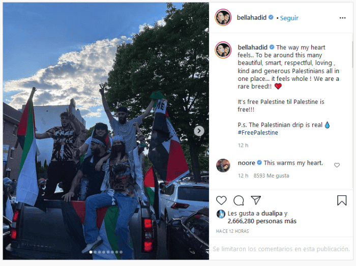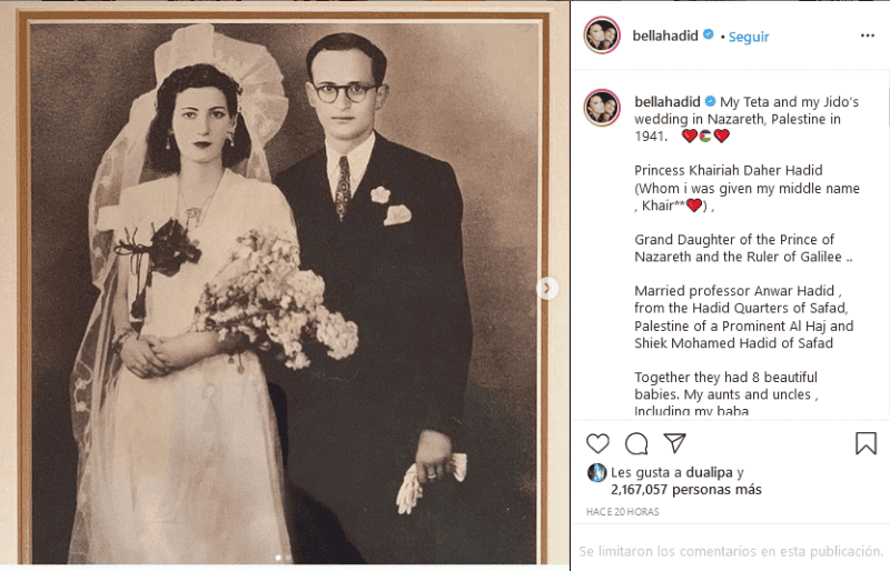 La supermodelo estadounidense Bella Hadid salió en defensa una vez más del pueblo de Palestina, donde tiene sus raíces, con un mensaje en su página de Instagram, en la que habla de la historia de su familia."Amo a mi familia, amo mi herencia, amo Palestina. Me mantendré firme para mantener su esperanza de una tierra mejor en mi corazón. Un mundo mejor para nuestra gente y las personas que los rodean. Nunca podrán borrar nuestra historia. ¡La historia es historia!", señaló la modelo, que en otras ocasiones ha recurrido a las redes en apoyo a Palestina.Hadid, que participó la noche del sábado en una marcha en apoyo a Palestina en el condado neoyorquino de Brooklyn, acompaña su mensaje con una foto de sus abuelos, Khairiah Daher Hadid y Anwar Hadid, el día de su boda, quienes tuvieron ocho hijos, entre ellos su padre, Mohamed Hadid, según recuerda.Agrega que "fueron sacados de sus hogares en Palestina en 1948, convirtiéndose en refugiados en Siria, luego en el Líbano y luego en Túnez".De acuerdo con el New York Post, Hadid acudió a la marcha vistiendo la tradicional keffiyeh, portando la bandera palestina y un símbolo de la paz.La marcha en apoyo a Palestina se realizó tras la escalada del conflicto entre Israel y Palestina, que hoy se analiza en el Consejo de Seguridad de Naciones Unidas.Indica además que antes de la marcha la cotizada modelo había publicado un video en apoyo de la patria de su padre, incluida una imagen de lágrimas que corrían por su rostro."No te puedes permitir la insensibilidad de ver cómo se quita una vida humana. Simplemente no puedes. Las vidas de los palestinos son las que ayudarán a cambiar el mundo. Y nos los están quitando por segundo.#Liberen Palestina", escribió en el texto que acompañó el video, de acuerdo con el diario.GC