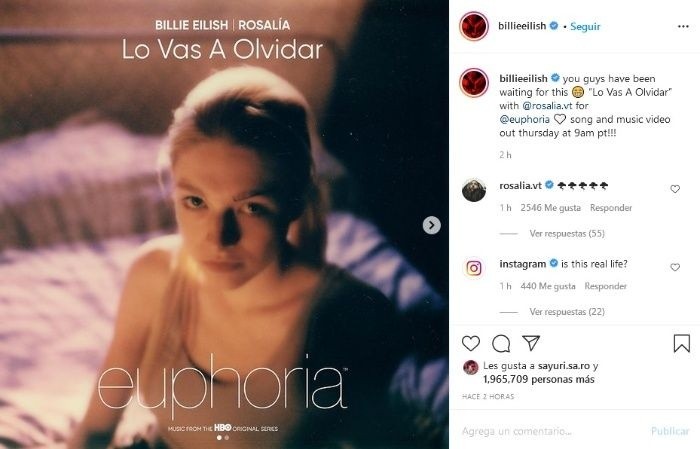 Billie Eilish y Rosalía lanzaron este jueves "Lo Vas A Olvidar", sin duda una de las colaboraciones más esperadas desde el año pasado.El tema que es parte del soundtrack del segundo episodio especial de la serie de HBO Max "Euphoria" que saldrá el 24 de enero.Eilish sorprendió a sus seguidores cantando un pedazo de la canción en español, que cuenta con más de 900 mil reproducciones en Youtube en pocas horas.Hace algunos meses las cantantes anunciaron que trabajarían juntas sin embargo por la pandemia del coronavirus se atrasó el proyecto, sin embargo hace algunos días compartieron un pequeño promocional del video para premiar a sus fans.