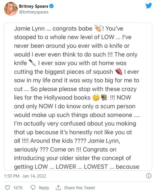 Britney Spears generó revuelo en Twitter al estallar nuevamente contra su hermana Jamie Lynn, la cantante no se quedó callada y acusó a Jamie de seguir colgándose de su imagen para poder subir la venta de ejemplares de su nuevo libro "Things I Should Have Said"; además de desmentir las declaraciones que hizo durante su visita al programa "Good Morning America".El 13 de enero la hermana menor de Britney acudió a una entrevista con la presentadora JuJu Chen, donde habló del conflicto que tiene con su hermana, asegurando que nada tuvo que ver con la tutela de la reina del pop, porque en el momento en que esto se dio ella tenía 17 años y estaba embarazada, por lo que su atención estaba en otro lado, pero señaló que siempre estuvo al lado de su hermana mayor y que incluso buscó la manera de que ella quedara libre, pero lo que molestó a Spears, es que Jamie asegurara que antes de quedar bajo la tutela de su padre, el comportamiento de la cantante era errático, paranoico y en espiral."Mi hermana dijo que mi comportamiento estaba fuera de control. Ella nunca estuvo muy cerca de mí en ese momento, hace 15 años, entonces, ¿por qué están hablando de eso a menos que ella quiera vender un libro a mis expensas?", escribió la intérprete de Toxic en un largo mensaje.Britney comentó que vio la entrevista mientras pasaba por una fiebre de 40 grados y un terrible dolor de cabeza, por lo que decidió que todo lo que se estaba diciendo ahí no le importara, pero esto no parece ser así, porque también se pronunció sobre lo dicho por su hermana menor, respecto al problema que tuvieron en 2017 cuando Jamie Lynn en los Radio Disney Music Awards cantó un mix de los éxitos de su hermana y a ella no le gustó; la estrella de "Zoey 101" declaró que eso ya estaba arreglado y olvidado con Britney."Sé que puede parecer una tontería para la mayoría de la gente, pero yo escribí muchas de mis canciones y mi hermana era un bebé. Nunca tuvo que trabajar por nada. ¡A ella siempre se lo dieron todo!", expresó la princesa del pop.La cantante de "Baby one more time", remató asegurando que su familia arruinó sus sueños, que siempre la han hundido y herido, por lo que se siente muy molesta con ellos.Jamie Lynn no se quedó callada y respondió en Twitter:"Odio reventar la burbuja de mi hermana, pero mi libro no es sobre ella. No tengo la culpa de haber nacido una Spears también, y que algunas de mis experiencias involucren a mi hermana. He trabajado duro desde antes de ser adolescente. Y he construido mi carrera a pesar de ser solo la hermana menor de alguien", escribió.Y agregó: "No hay lados, y no quiero drama. Pero digo mi verdad para sanar mi trauma, para poder cerrar este capítulo y seguir adelante, y deseo que mi hermana pueda hacer lo mismo. No importa lo que pase, siempre amaré a mi hermana mayor y estaré aquí para ella. Es hora de poner fin al caos malsano que ha controlado mi vida durante tanto tiempo".AF