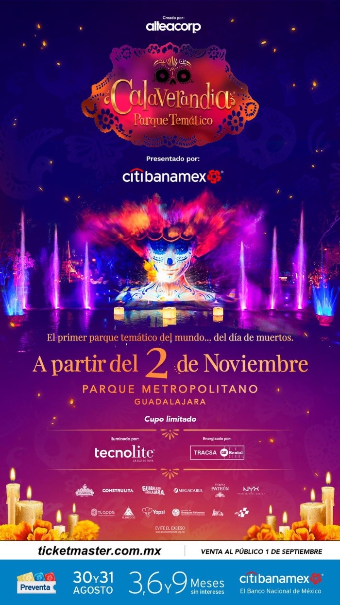 Alteacorp, compañía creadora del parque temático Calaverandia, ha confirmado que esta atracción regresará a Guadalajara y aunque en sus ediciones anteriores este montaje multidisciplinario se había realizado en el Parque Ávila Camacho, ahora cambiará de sede para instalarse en el Parque Metropolitano, en la llamada fracción del Anillo Jacarandas.Calaverandia, enfocado en resaltar la tradición de Día de Muertos, comenzará su temporada en el Parque Metropolitano a partir del 2 de noviembre, y la venta de boletos comenzará –vía Citibanamex en fase de preventa- el 30 y 31 de agosto, en tanto que la venta general dará inicio el 1 de septiembre. Las actividades de Calaverandia estarán disponibles a partir del 2 de noviembre en el Parque Metropolitano, con horario de ingreso a esta zona de domingo a jueves de las 19:00 a media noche, y los viernes y sábado de 19:00 a 01:00 horas.De acuerdo a los organizadores, el ingreso a Calaverandia tendrá un costo de 560 pesos para adultos en su pase general, en tanto que para los niños de 4 a 12 años será de 290 pesos; para los pases Comfort Pass de adulto el precio (a partir de los 13 años de edad) será de mil 120 pesos y el Comfort Pass para niños de 4 a 12 años será de 660 pesos, más cargos por servicio Ticketmaster en todas su modalidades de ingreso.Como ya lo ha mostrado en sus pasadas ediciones, Calaverandia se conforma de diversos escenarios y pasajes temáticos dentro de la tradición de Día de Muertos, apostando por música, performance, espectáculos multimedia y zonas gastronómicas con platillos típicos de México y de temporada.El espectáculo multimedia ALMA apostará por el formato 4D, con una monumental proyección sobre una pantalla de agua y jets de 15 metros de altura, así como iluminación robótica, para narrar la historia alrededor de la tradición de Día de Muertos y su impacto cultural. En el caso de Catrinesque Citibanamex, esta atracción se enfocará en rendir homenaje a la clásica figura de la Catrina utilizando el arte circense y folclor mexicano, en tanto que el Gran Altar rendirá homenaje a quienes se han adelantado en el camino con una instalación de 12 metros de altura para fungir también como escenario de un show multidisciplinario.Para la zona de Inframundo, este pasaje es un recorrido en el mundo mágico de las tradiciones y leyendas prehispánicas inspiradas en el Mictlán Azteca. Otra de las principales atracciones es el Cementerio Interactivo, que ofrecerá a sus visitantes una experiencia llena de misticismo y magia.FS